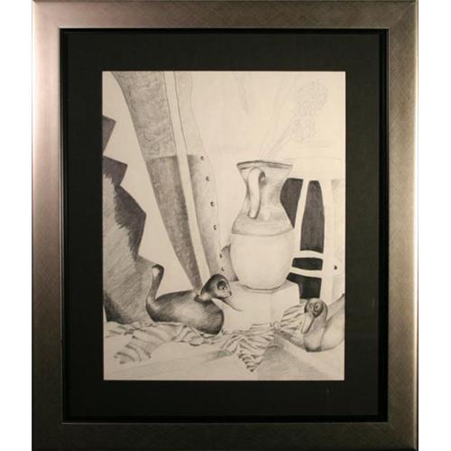 This well-crafted original Jill Thomas pencil still life shows her true talent as drawing specialist. The artist?s framing of light and shadow is a true highlight of this piece as the piece depicts a still life of two wooden mallards and a pitcher with flowers on a box. With a knack for shading techniques, the artist renders this drawing as work of simple beauty. This 15? x 19? original has been newly framed in a stunning silver and gold frame with black inner wood over a single black mat with black core. In great condition, this final 24.25? x 28.25? masterpiece, completed on October 22, 1988, is deserving of any art fanatic?s attention.