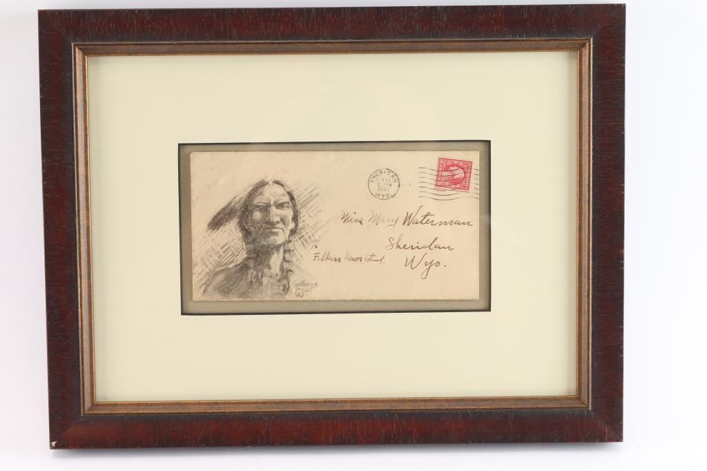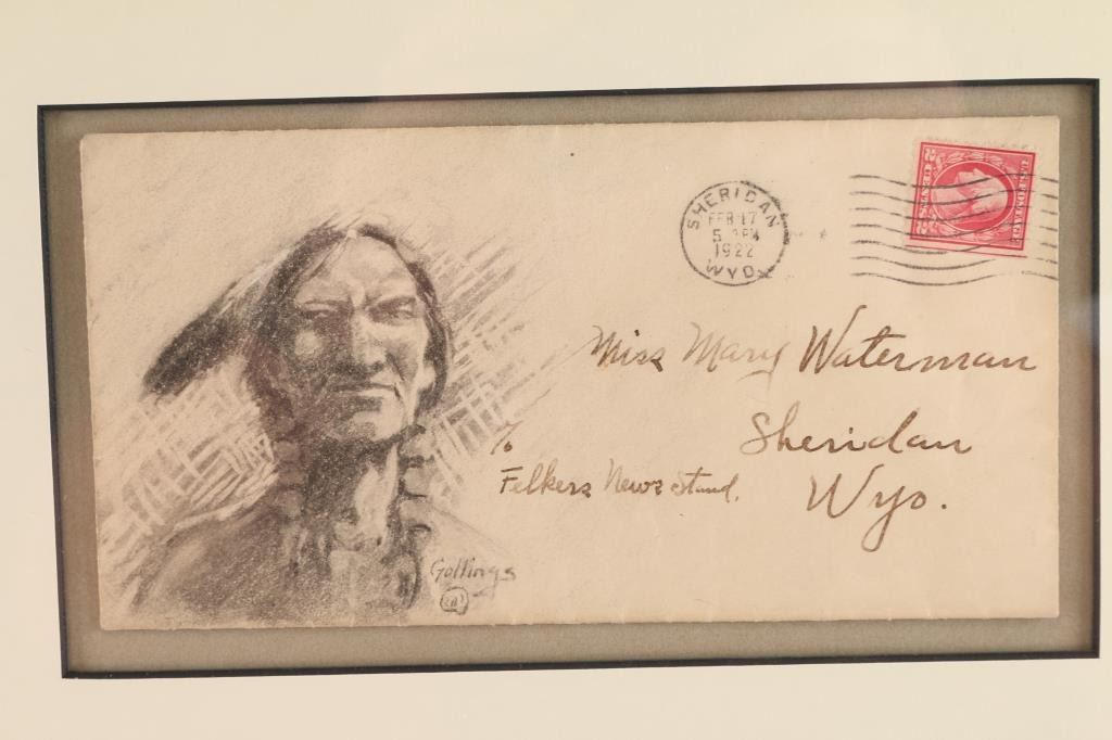 By E. William Gollings, depicts Indian head on stamped envelope to Miss Mary Waterman, Felkers News Stand, Sheridan, Wyoming, dated 1922. Framed, measures 15" x 11 1/4". De-accessioned from The Phippen Art Museum. William Gollings' lifelong artistic preoccupation was similiar to famed western artist Frederic Remington. Like Remington, he longed for a forgotten west, and went about authenticating himself in order to render it carefully and faithfully. The result was much the same as that of his idol, as William Gollings' work has much the same elegiac quality as Remington's better creations. William Gollings died in 1932 at the age of 54 in Sheridan Wyoming. His paintings, collected and treasured all over the American west, bear his signature, his last name followed by a pony track insignia.