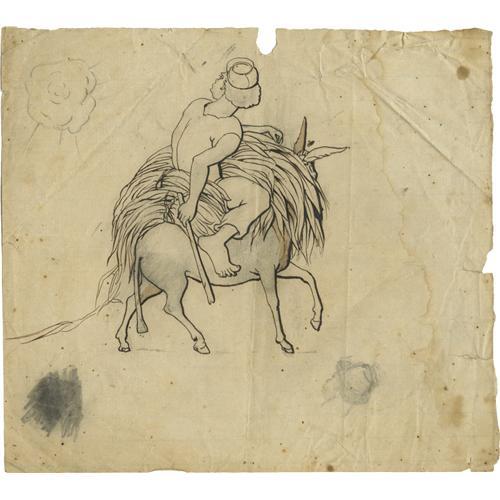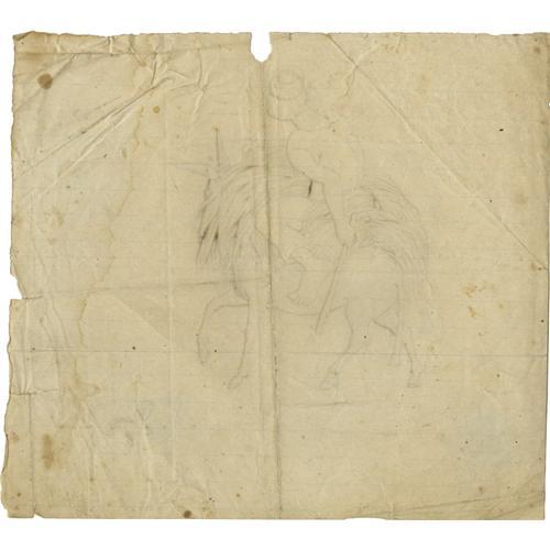 <B>Original Pencil and Ink Sketch of a Slave</B></I> on the back of a donkey carrying a load of tobacco leaves. The barefoot male slave is wearing a kepi and looking over to his left where a large puff of smoke has been drawn to symbolize an explosion, possibly from a nearby battle. From the Avery Estate. 8" x 7" in size, generally very good condition with folds, crinkling, edge roughness, and some dampstaining away from the sketch. Great example of folk art from the Civil War period.<BR><BR><b>Shipping:</b> Flat Material, Small (<a target="_blank" href="http://www.heritageauctions.com/common/shipping.php">view shipping information</a>)