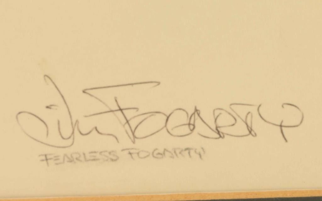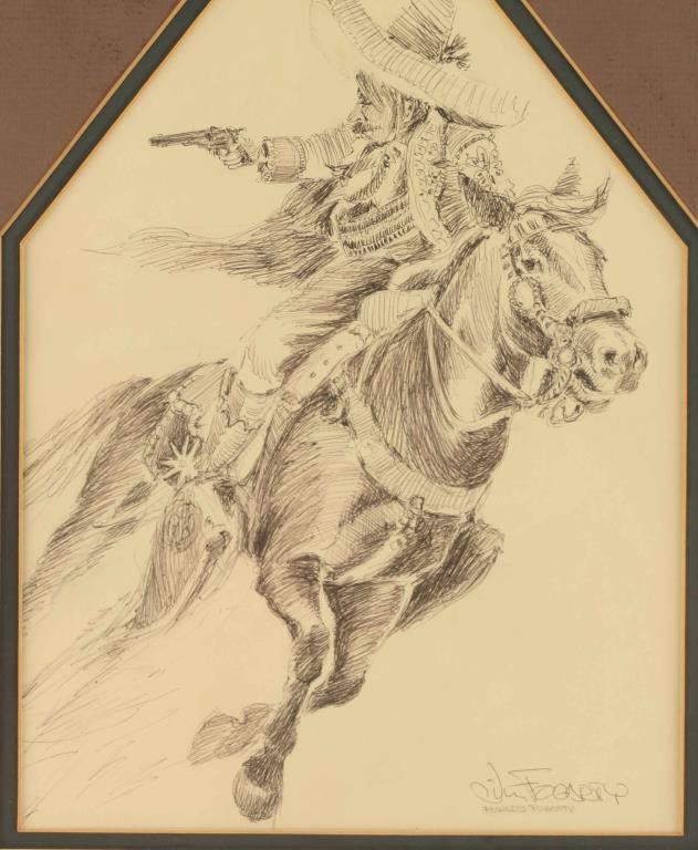 by Jim Fogarty depicting a shooting desperado on horseback. Double mat and frame.