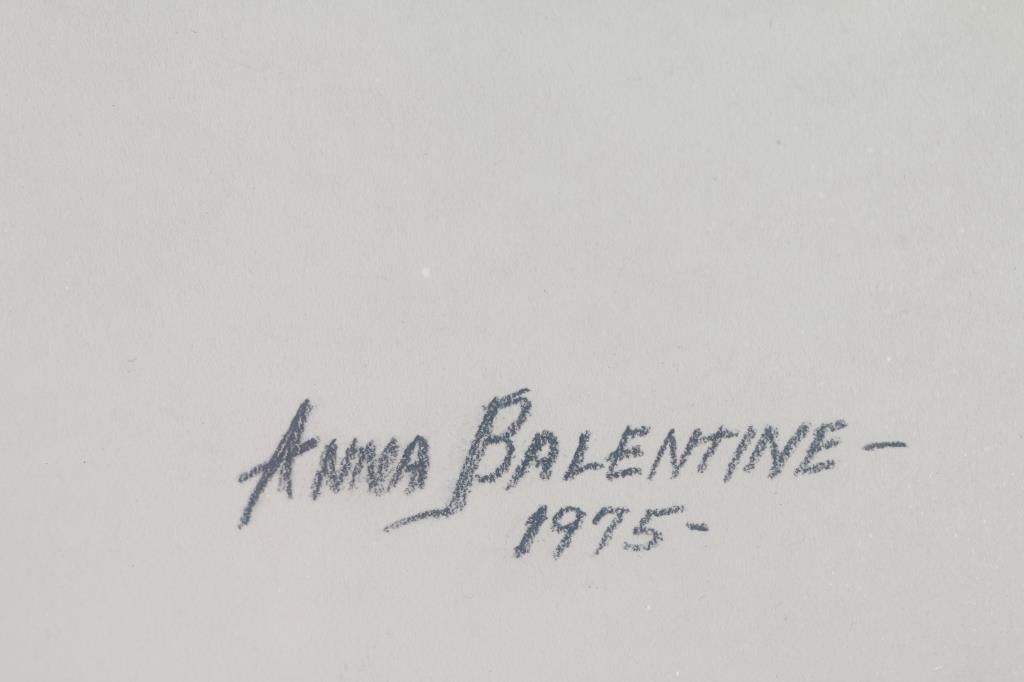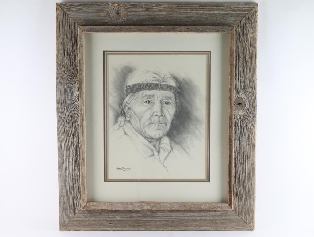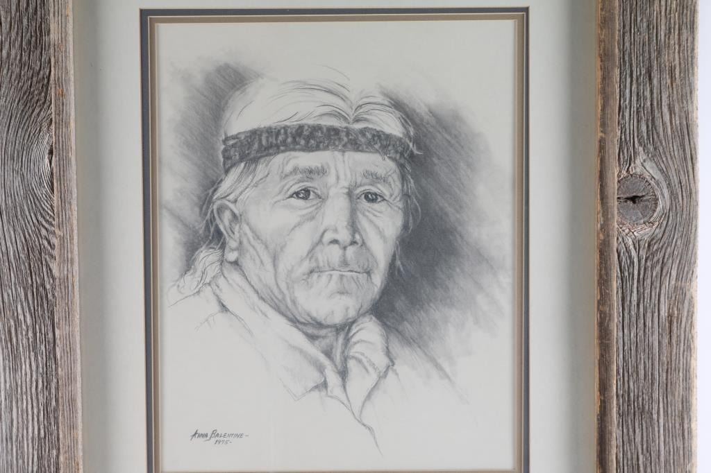 by Anna Balentine, hand-signed lower left 1975, depicting an Indian man. Measures 13x17, double matted in barnwood frame.