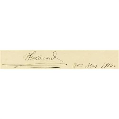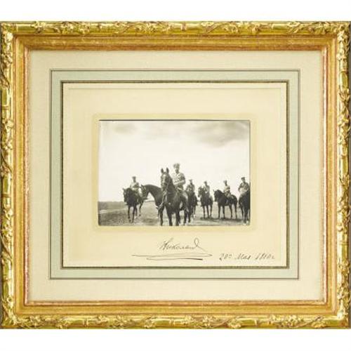 <B>Original Photograph of Tsar Nicholas II</B></I><BR><BR>Handsome depiction of the Nicholas II, Tsar of Russia (r. 1894-1917) on horseback, signed <I>Nicolai</B></I> in Cyrillic, and dated May 20, 1910, 14 x 15 in.<BR><BR><b>Shipping:</b> Requires 3rd Party Shipping (<a target="_blank" href="http://www.heritageauctions.com/common/shipping.php">view shipping information</a>)