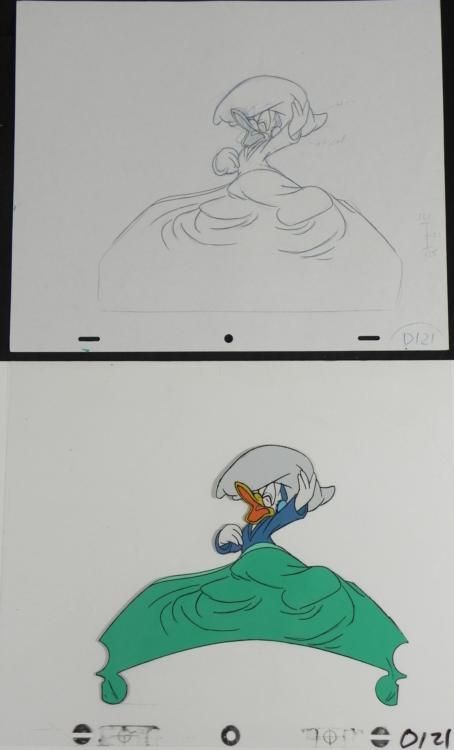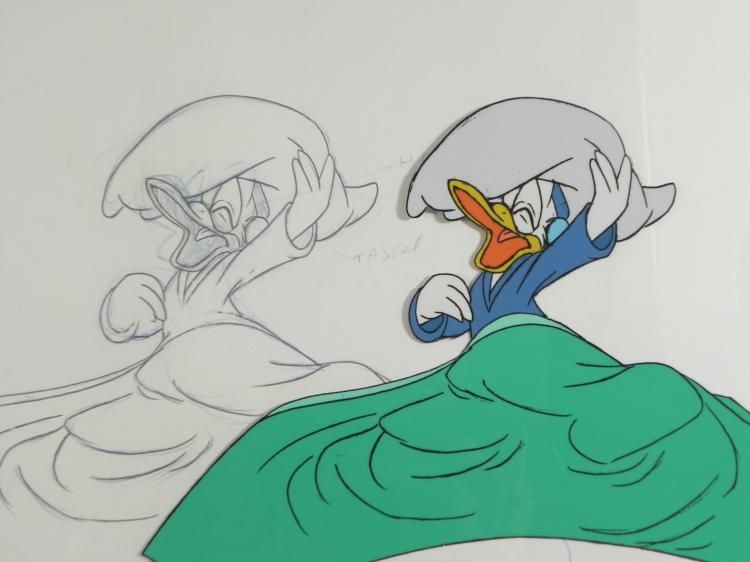 Donald Fauntleroy Duck is a cartoon character created in 1934 at Walt * Disney Productions. Donald is an anthropomorphic white duck with a * yellow-orange bill, legs, and feet. He typically wears a sailor suit * with a cap and a black or red bow tie. Donald * is most famous for his semi-intelligible speech and his mischievous and * irritable personality. Along with his friend Mickey Mouse, Donald is * one of the most popular Disney characters and was included in TV Guide's * list of the 50 greatest cartoon characters * of all time in 2002. * * Maybe if I put this pillow over my head, the noise will stop?? * Original Animation Cel and * DrawingOriginal "rough" drawing in black and * non-photo blue pencil with the notations in non-photo * blueOverall size is a 12-field drawing that is 10 * 1/2" x 12 1/2"Size of cel: 10 1/2" x 12 * 1/2"Overall condition: * Cel- Excellent & Drawing- Very good; spot of surface wear to the paper * This is * an original hand-painted cel used in * the production of an episode of "Donald Duck." Each cel represents a * slight change in position of the characters. When individually * photographed and projected in rapid succession, the images * appear to move. To * create production cels, the original animator's drawing is transferred * onto an acetate cel (by hand-inking and/or photo copying). The cel is * then hand-painted on the reverse side. * * * * The drawing and cel are ready to be matted and * framed. The notations are located at the bottom of * both of the cel and the top and bottom of the drawing. *