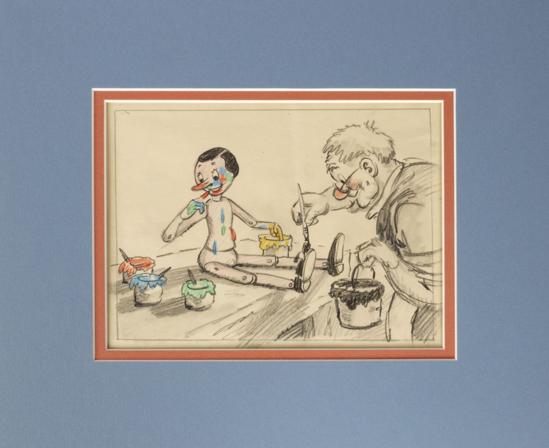(Walt Disney Studios, c.1939) An original storyboard drawing of Pinocchio by story artist Homer Brightman. Known for his story work on many iconic shorts at Walt Disney Productions between 1935 and 1950, Brightman also worked as a story artist on Pinocchio. This storyboard drawing shows Geppetto painting Pinocchio and is accomplished in black and colored pencils on thin art paper. The artwork has an image size of 5.25"x7.25" on 6.5"x8.5" paper. The condition is very good with some pin holes around the border from the storyboard's original use, and a faint crease down the center. The drawing is hinged within a mat frame for display.