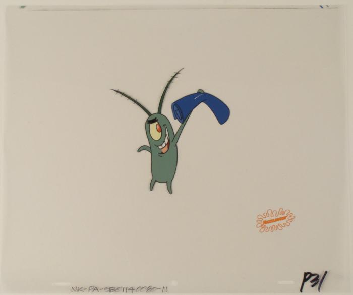 To create production cels, the original animator's drawing is transferred onto an acetate cel (by hand-inking and/or photo copying). The cel is then hand-painted on the reverse side. The cel is ready to be matted and framed. The animator's notations are at the bottom of the cel. There is some slight paint fade to Plankton's outline. There is a Nickelodeon TV logo on the bottom right of the cel.