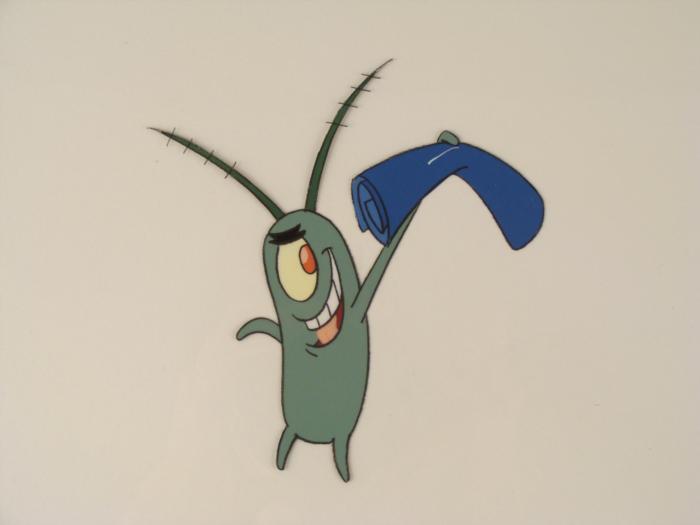 This original animation cel is from the Nickelodeon TV show SpongeBob Squarepants. The story takes place under the deep blue sea in Bikini Bottom, where SpongeBob resides. SpongeBob, who is a yellow, porous sponge, is your typical happy-go-lucky character, as he is always cheerful and enjoys making people laugh. Patrick Star, SpongeBob's neighbor who is a starfish, is your average children's show idiot, as he boasts knowing nothing and is often getting himself into ridiculous situations. Between the homes of these two lies the home of the miserable Squidward, a squid, who is known for being grouchy and playing tricks on SpongeBob and Patrick. Both SpongeBob and Squidward work at the Krusty Krab, a fast food business run by the greedy money-loving Mr. Krabs, a crab, the arch rival of the evil, possibly misunderstood, Plankton. Another neighbor, Sandy Cheeks, an athletic squirrel who normally wears an astronaut's space suit, was introduced in "Tea at the Treedome." She spends most of her time inventing and experimenting. Plankton appears to be holding blueprints.Original Production Animated Cel Overall Size of Cel: 10 1/2" x 12 1/2" Very Good ConditionThis is an original hand-painted cel set-up used in the production of an episode of "SpongeBob SquarePants." Each one-of-a-kind set-up represents a slight change in position of the characters. When individually photographed and projected in rapid succession, the images appear to move.