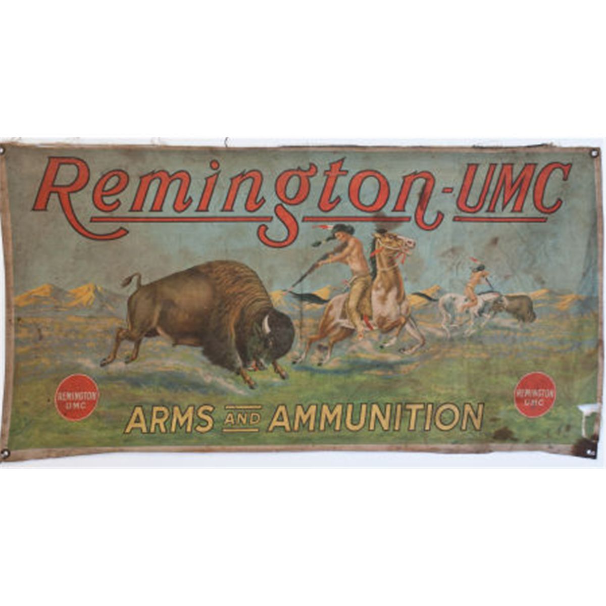Original Polychrome Remington UMC Cloth Advertising Banner. The colorful commercial Remington/UMC ammunition fabric advertising banner, depicting mounted Indian warriors hunting buffalo from horseback. Large printed legend reading: Remington/UMC/Arms and Ammunition. Brass grommets in corners for hanging. Size: 27-inches high X 53-inches long. Condition: Good. Showing age wear, some fading, tears and staining.