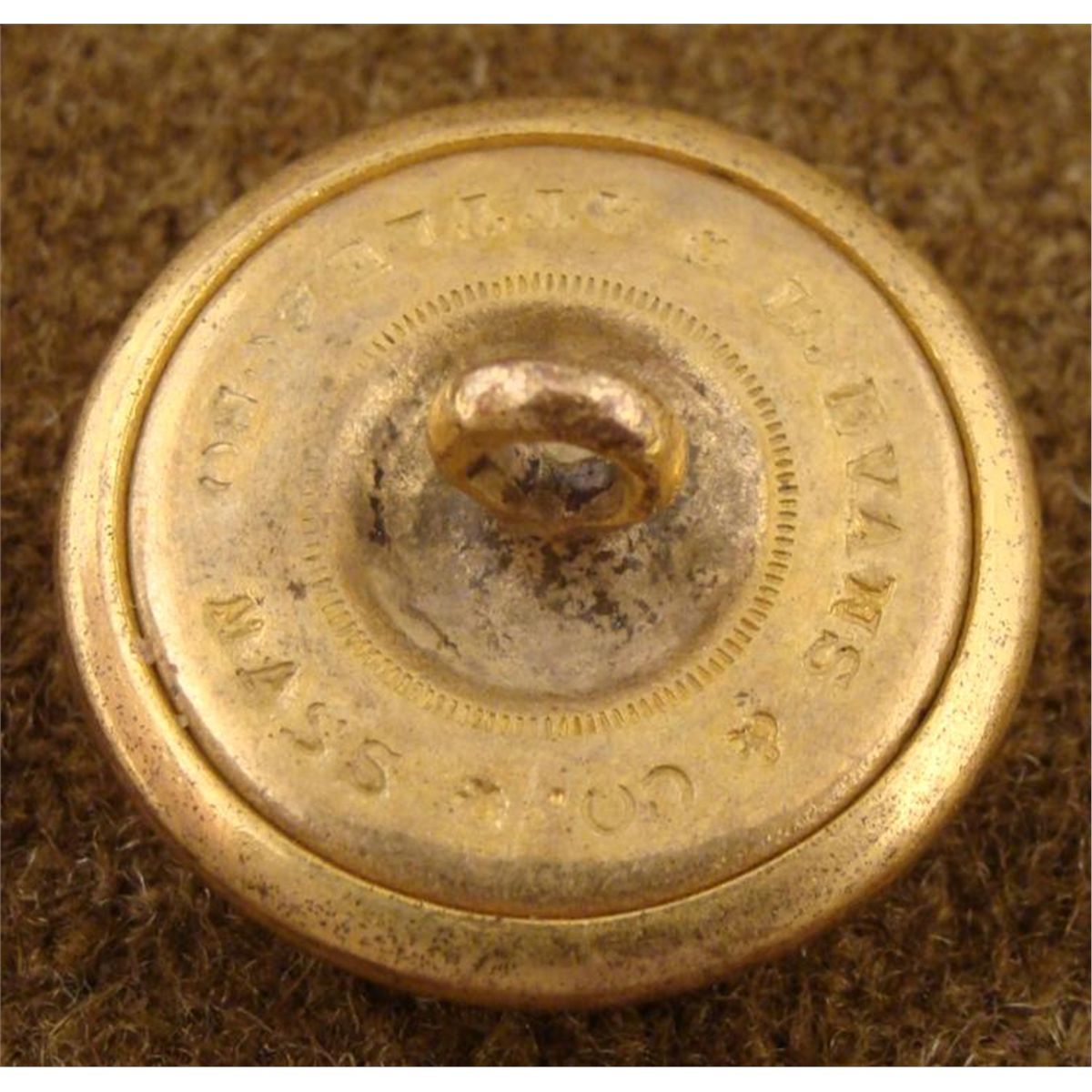 This is a Union Ordnance Corps Button that dates from the pre-Civil War period. It is gilt, and features a design of crossed cannons and cannonball. It was made by D. Evans & CO. Attleboro Mass. The maker name is on the reverse inside a ribbon design, with a rosette in between. It is 7/8" in diameter. It is in excellent condition, bright and showing fine detail. * This is a rare memento of the Union army just prior to the Civil War.
