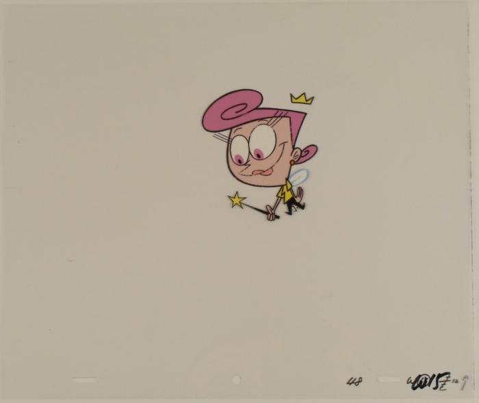 This original animation cel is from the Nickelodeon TV show Fairly Odd Parents. Timmy Turner is a short, buck-toothed 10-year-old boy with a pink cap who lives in Dimmsdale, a small suburban town with his dim-witted parents. His life is constantly miserable, due to the fact that his parents are rarely home and he is babysat by an incredibly evil teenager, Vicky, and that, generally, no one understands him (as indicated by the show's theme song). But everything changes when he receives two fairy parents: Cosmo and his wife, Wanda and later, their son Poof. Timmy learns that his fairy godparents are capable of granting him any wish he wants within certain limits. However, Timmy's immature nature causes him to sometimes ask for wishes that unintentionally result in disaster, and he and his fairy parents and fairy brother must find a way to "unwish" the wish. · Original Production Animated Cel · Overall Size of Cel: 10 1/2" x 12 1/2" · Very good Condition This is an original hand-painted cel set-up used in the production of an episode of "Fairly Odd Parents." Each one-of-a-kind set-up represents a slight change in position of the characters. When individually photographed and projected in rapid succession, the images appear to move.To create production cels, the original animator's drawing is transferred onto an acetate cel (by hand-inking and/or photo copying). The cel is then hand-painted on the reverse side. The cel received by the winning bidder may be every so slightly different from the one in the auction photos. The cel is ready to be matted and framed. The animator's notations are at the bottom of the cel. There is some paint fade to Wanda's outline.