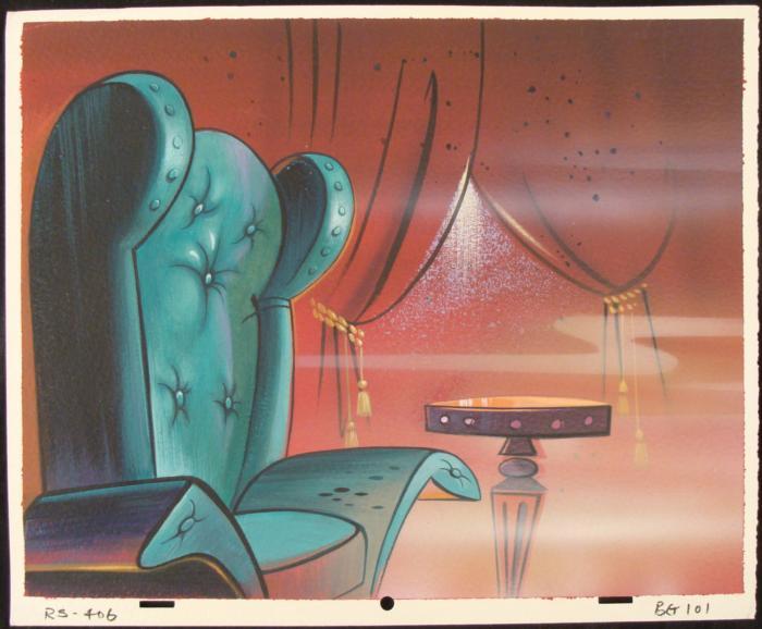 This original hand-painted background is from the Nickelodeon TV show Ren & Stimpy. The show follows two characters - Ren, a crazy Chihuahua - and - Stimpy, an incredibly stupid cat - as they think up to all kinds of hair brained schemes and get themselves into some sticky situations. The Ren and Stimpy Show debuted in August 1991 with a two-part episode, 'Stimpy's Big Day / The Big Shot' and became an instant hit. It was the third Nicktoon ever to be aired on the Network alongside Doug and Rugrats. It looks like an apperant mob boss was once in this chair with the haze and all...Original Production Background Overall Size: 10 3/4" x 13" Very good condition; it has been storedOriginal Production Backgrounds are used in the making of the final version of animated productions. The background establishes the location and the overall good mood of the scenee. Typically, a background layout artist creates a drawing to establish the content of the scene, placement of characters, perspective and camera angle. Based on this drawing, the background artist creates a preliminary painting to confirm all of the scenes details, then the final production background which is used in the filming of the scene. When these backgrounds are individually photographed behind the progression of production cels, and projected at a rapid succession, the images in the foreground appear to move, creating an animated scene. The background is to be matted and framed. It is a colored background with the animator's notations shown at the bottom.