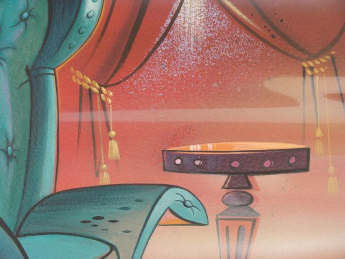 This original hand-painted background is from the Nickelodeon TV show Ren & Stimpy. The show follows two characters - Ren, a crazy Chihuahua - and - Stimpy, an incredibly stupid cat - as they think up to all kinds of hair brained schemes and get themselves into some sticky situations. The Ren and Stimpy Show debuted in August 1991 with a two-part episode, 'Stimpy's Big Day / The Big Shot' and became an instant hit. It was the third Nicktoon ever to be aired on the Network alongside Doug and Rugrats. It looks like an apperant mob boss was once in this chair with the haze and all...Original Production Background Overall Size: 10 3/4" x 13" Very good condition; it has been storedOriginal Production Backgrounds are used in the making of the final version of animated productions. The background establishes the location and the overall good mood of the scenee. Typically, a background layout artist creates a drawing to establish the content of the scene, placement of characters, perspective and camera angle. Based on this drawing, the background artist creates a preliminary painting to confirm all of the scenes details, then the final production background which is used in the filming of the scene. When these backgrounds are individually photographed behind the progression of production cels, and projected at a rapid succession, the images in the foreground appear to move, creating an animated scene. The background is to be matted and framed. It is a colored background with the animator's notations shown at the bottom.