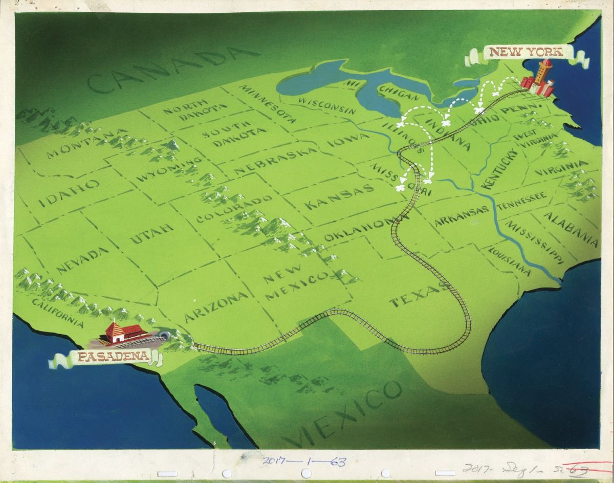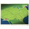 (Walt Disney Studios, 1943) Extremely rare original production background from "Victory Through Airpower". Signed on the reverse by Animation Director and Disney Legend Don DaGradi who later went on to co-write the screenplay for "Mary Poppins". The untrimmed background measures 12.5"x15.5". In fine condition with a 1" tear along the bottom edge. Several studio stamps and production numbers on the reverse.