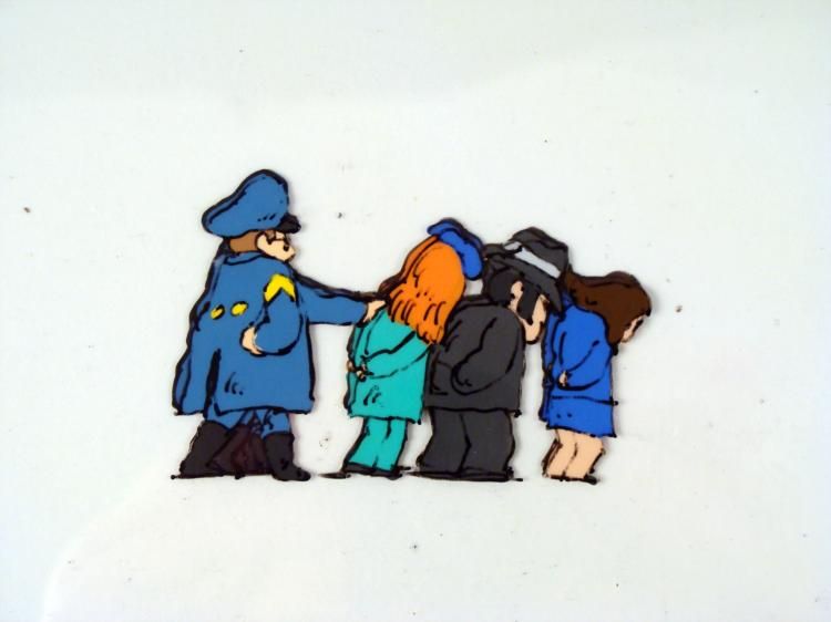 Alright, line them up, walk in a single file, and NO TALKING!!! We don't tolerate loud mouths!! * * Original Production Animated Cel Overall Size of Cel: 10 1/2" x 23 1/2" Very Good Condition * This is an original hand-painted cel set-up. Each one-of-a-kind set-up represents a slight change in position of the characters. When individually photographed and projected in rapid succession, the images appear to move. * * To create production cels, the original animator's drawing is transferred onto an acetate cel (by hand-inking and/or photo copying). The cel is then hand-painted on the reverse side. * * * The cel received by the winning bidder may be ever so slightly different from the one in the auction photos. * * * * * The cel is ready to be matted and framed. The animator's notations are at the top of the cel. There is some paint residue on the bottom of the cel. * * *