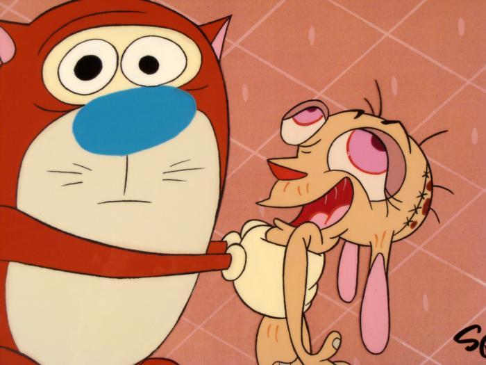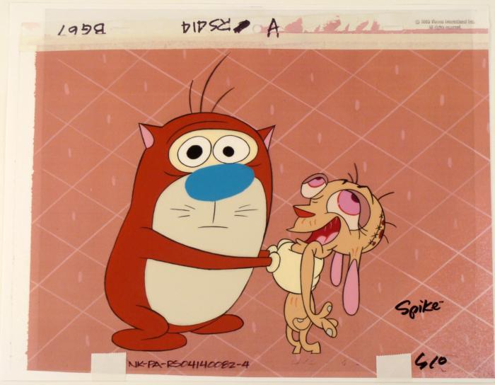 This is an original production animation cel from the Nickelodeon TV show Ren & Stimpy. The show follows two characters - Ren, a crazy Chihuahua - and - Stimpy, an incredibly stupid cat - as they think up to all kinds of hair brained schemes and get themselves into some sticky situations. The Ren and Stimpy Show debuted in August 1991 with a two-part episode, 'Stimpy's Big Day / The Big Shot' and became an instant hit. It was the third Nicktoon ever to be aired on the Network alongside Doug and Rugrats. I didn't do it, I swear. This thought is probably running through Stimpy's head.Original Production Art Cel Cel Overall Size of the Cel: 10 1/2" x 12 1/2" Overall Size of the Background: 11" x 14" Excellent condition This is an original hand-painted cel set-up used in the production of an episode of "The Ren & Stimpy Show." Each one-of-a-kind set-up represents a slight change in position of the characters. When individually photographed and projected in rapid succession, the images appear to move.