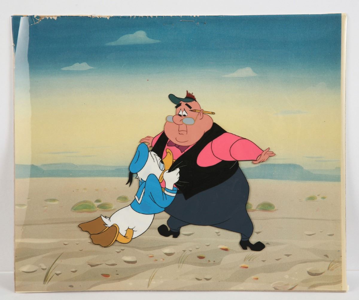 (Walt Disney Studios, 1950s/60s) An original hand-painted production cel of Donald Duck and J. Audubon Woodlore, more commonly known as "Ranger" Woodlore. This cel was trimmed and sold at the Disneyland Art Corner, and still has the Walt Disney Productions gold label on the reverse of it's backing. The cel, along with it's printed reproduction background, are stapled along the top edge to the backing. This cel measures 10"x12". In fine condition with minimal paint wear, and some wear to the top edge of the reproduction background.