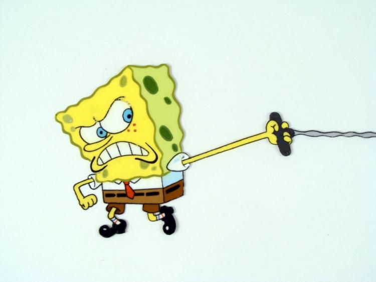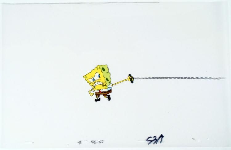 This original animation cel is from the Nickelodeon TV show SpongeBob Squarepants. The story takes place under the deep blue sea in Bikini Bottom, where SpongeBob resides. SpongeBob, who is a yellow, porous sponge, is your typical happy-go-lucky character, * as he is always cheerful and enjoys making people laugh. Patrick Star, SpongeBob's neighbor who is a starfish, is your average children's show idiot, as he boasts knowing nothing and is often getting himself into ridiculous situations. Between the homes of * these two lies the home of the miserable Squidward, a squid, who is known for being grouchy and playing tricks on SpongeBob and Patrick. Both SpongeBob and Squidward work at the Krusty Krab, a fast food business run by the greedy money-loving Mr. Krabs, a * crab, the arch rival of the evil, possibly misunderstood, Plankton. Another neighbor, Sandy Cheeks, an athletic squirrel who normally wears an astronaut's space suit, was introduced in "Tea at the Treedome." She spends most of her time inventing and experimenting. * * Pull...pull...pull * * * * * Original Production Animated Cel Overall Size of Cel: 10 1/2" x 16 1/2" Very Good Condition * This is an original hand-painted cel set-up used in the production of an episode of "SpongeBob SquarePants." Each one-of-a-kind set-up represents a slight change in position of the characters. When individually photographed and projected in rapid succession, * the images appear to move. * * To create production cels, the original animator's drawing is transferred onto an acetate cel (by hand-inking and/or photo copying). The cel is then hand-painted on the reverse side. * * * The cel is ready to be matted and framed. The animator's notations are at the bottom of the cel. * *