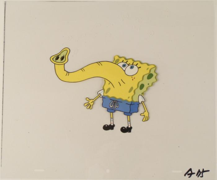 This original animation cel is from the Nickelodeon TV show SpongeBob Squarepants. The story takes place under the deep blue sea in Bikini Bottom, where SpongeBob resides. SpongeBob, who is a yellow, porous sponge, is your typical happy-go-lucky character, as he is always cheerful and enjoys making people laugh. Patrick Star, SpongeBob's neighbor who is a starfish, is your average children's show idiot, as he boasts knowing nothing and is often getting himself into ridiculous situations. Between the homes of these two lies the home of the miserable Squidward, a squid, who is known for being grouchy and playing tricks on SpongeBob and Patrick. Both SpongeBob and Squidward work at the Krusty Krab, a fast food business run by the greedy money-loving Mr. Krabs, a crab, the arch rival of the evil, possibly misunderstood, Plankton. Another neighbor, Sandy Cheeks, an athletic squirrel who normally wears an astronaut's space suit, was introduced in "Tea at the Treedome." She spends most of her time inventing and experimenting. It looks like SpongeBob has transformed into an elephant.Original Production Animated Cel Overall Size of Cel: 10 1/2" x 12 1/2" Very Good ConditionThis is an original hand-painted cel set-up used in the production of an episode of "SpongeBob SquarePants." Each one-of-a-kind set-up represents a slight change in position of the characters. When individually photographed and projected in rapid succession, the images appear to move.