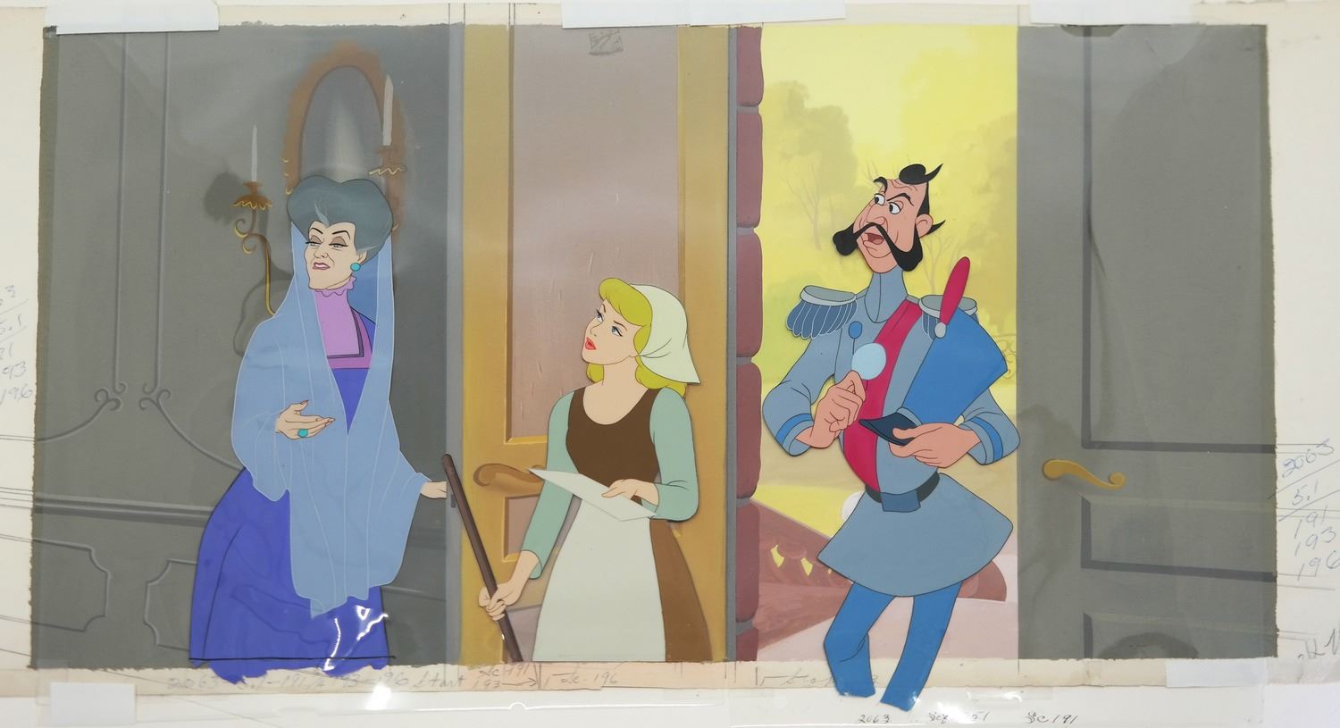(Walt Disney Studios, 1950) An impressive 12"x23" pan production background featuring cels of Cinderella, Lady Tremaine, and the Duke from "Cinderella". The cel of Lady Tremain is matching to the background while the cels of Cinderella and the Duke were added later. The cel of Cinderella has been trimmed to image and placed on a new cel. All the cels are in very good condition.