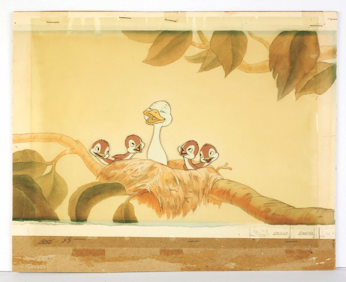 (Walt Disney Studios, 1939) Beautiful original production cel and matching hand-painted production background from "The Ugly Duckling". The untrimmed cel measures 10"x12" and has been stapled to the slightly trimmed 9.5"x14" matching background. The piece was most likely prepared at the studio for publicity use and later given as a gift. In fine condition with all paint intact.