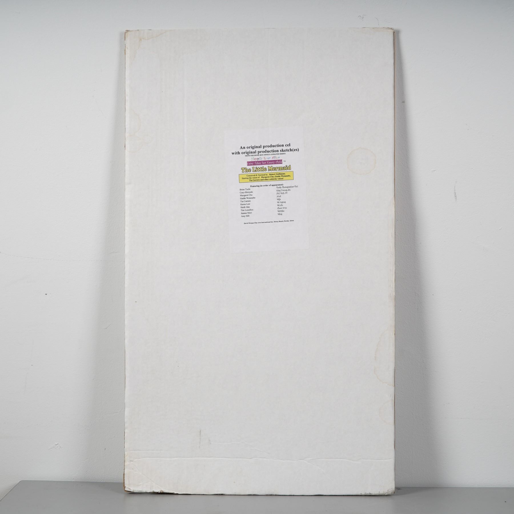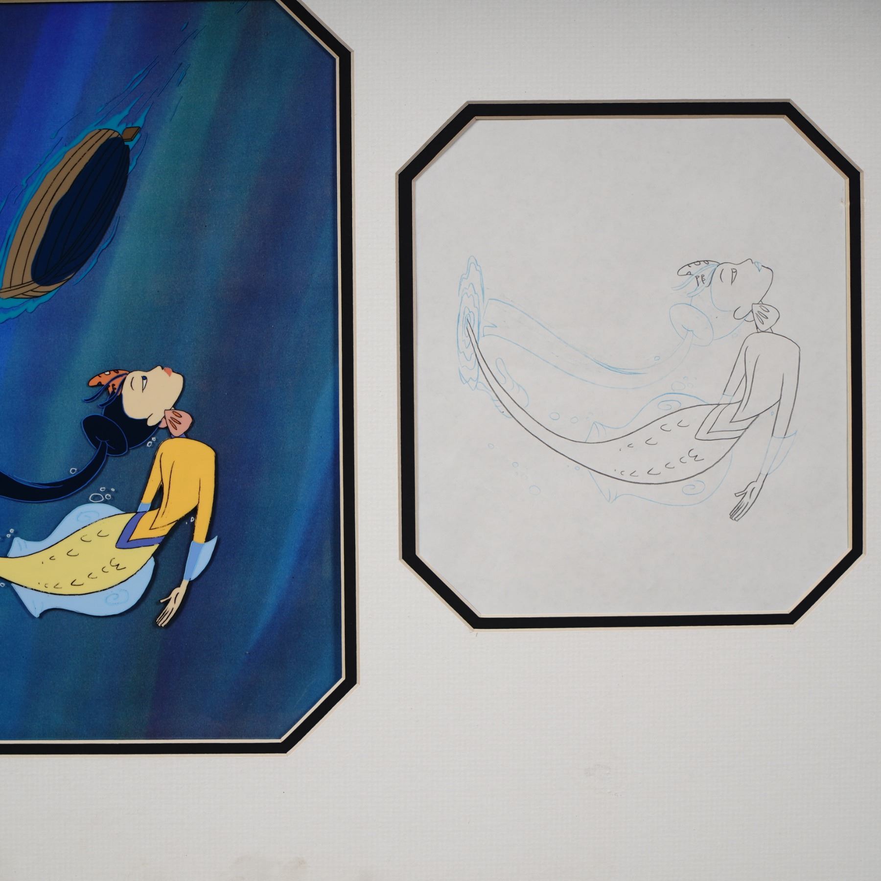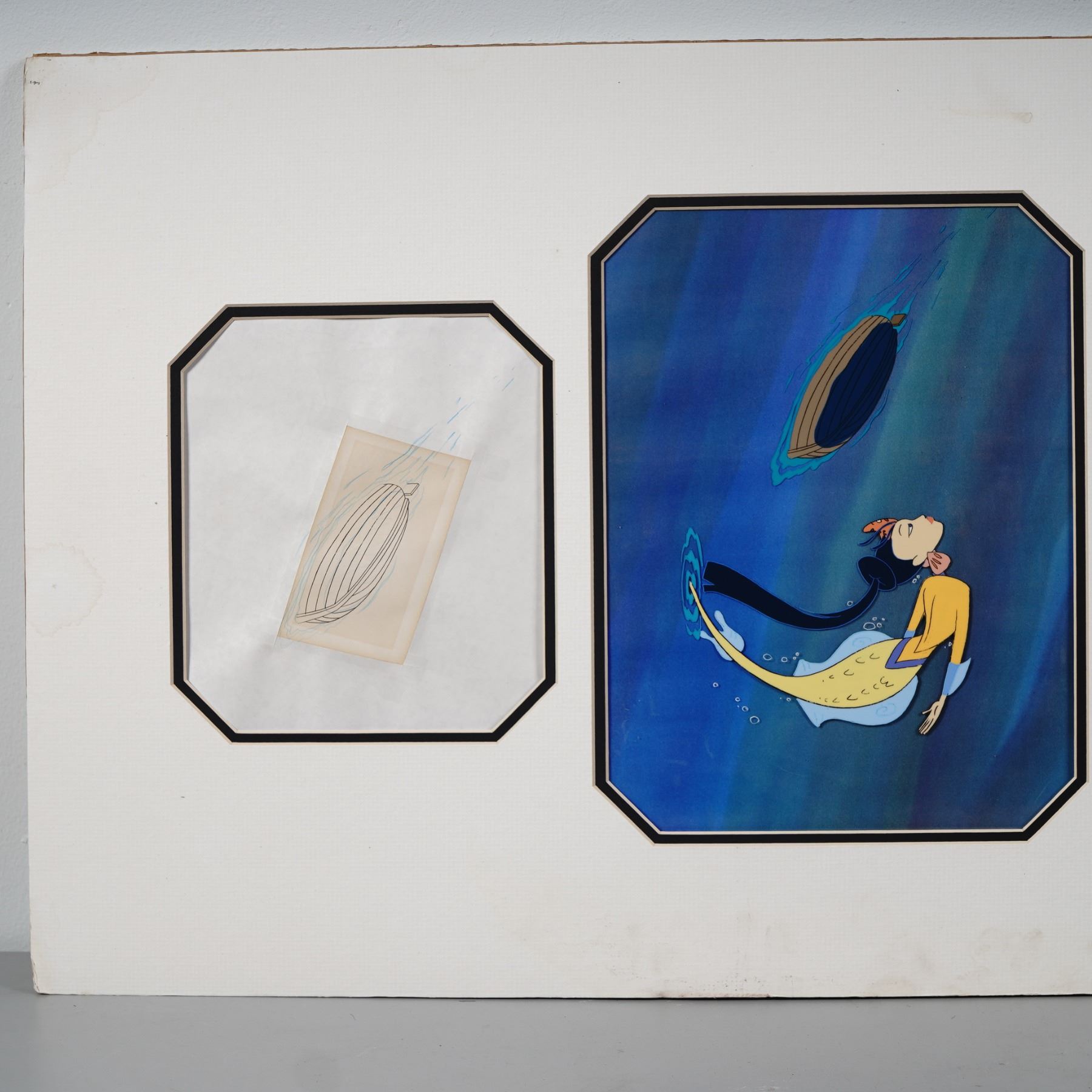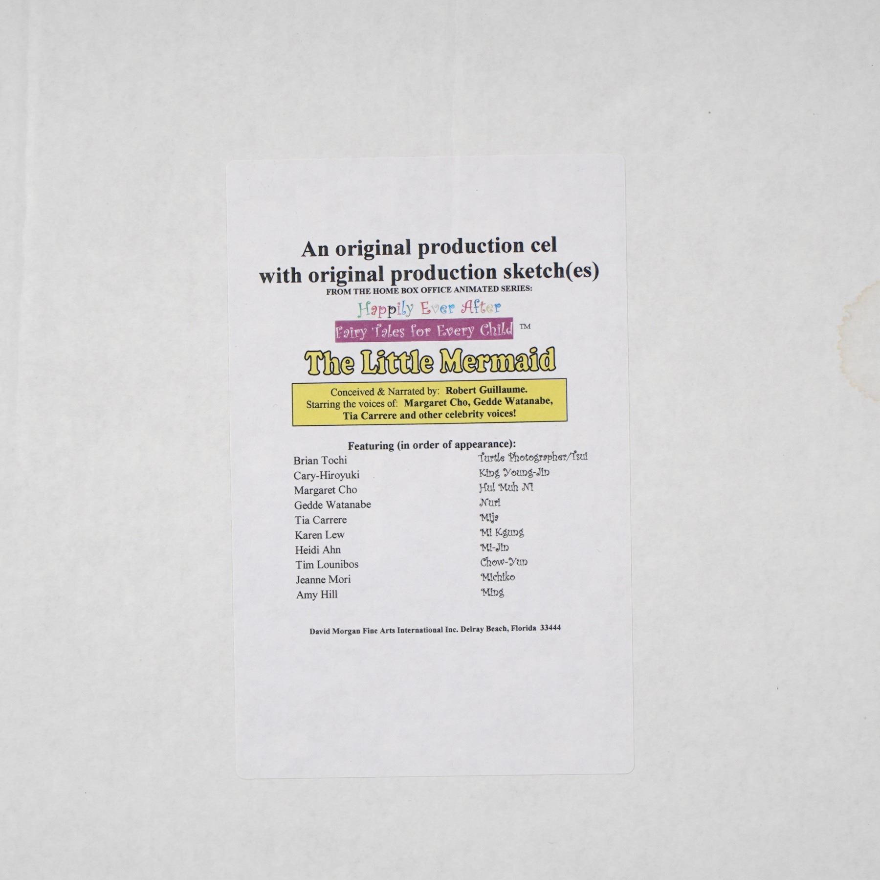 This original production cel and accompanying sketches are from the HBO animated series Happily Ever After: Fairy Tales for Every Child, featuring The Little Mermaid. Included are a hand-painted cel of the mermaid underwater beside a boat, along with two original production sketches"one showing the character and the other the boat element"matted together in a single display. The series, narrated by Robert Guillaume, starred Margaret Cho, Gedde Watanabe, Tia Carrere, and other notable voices, reimagining classic tales with a multicultural cast. Documentation from David Morgan Fine Arts International Inc. is included.