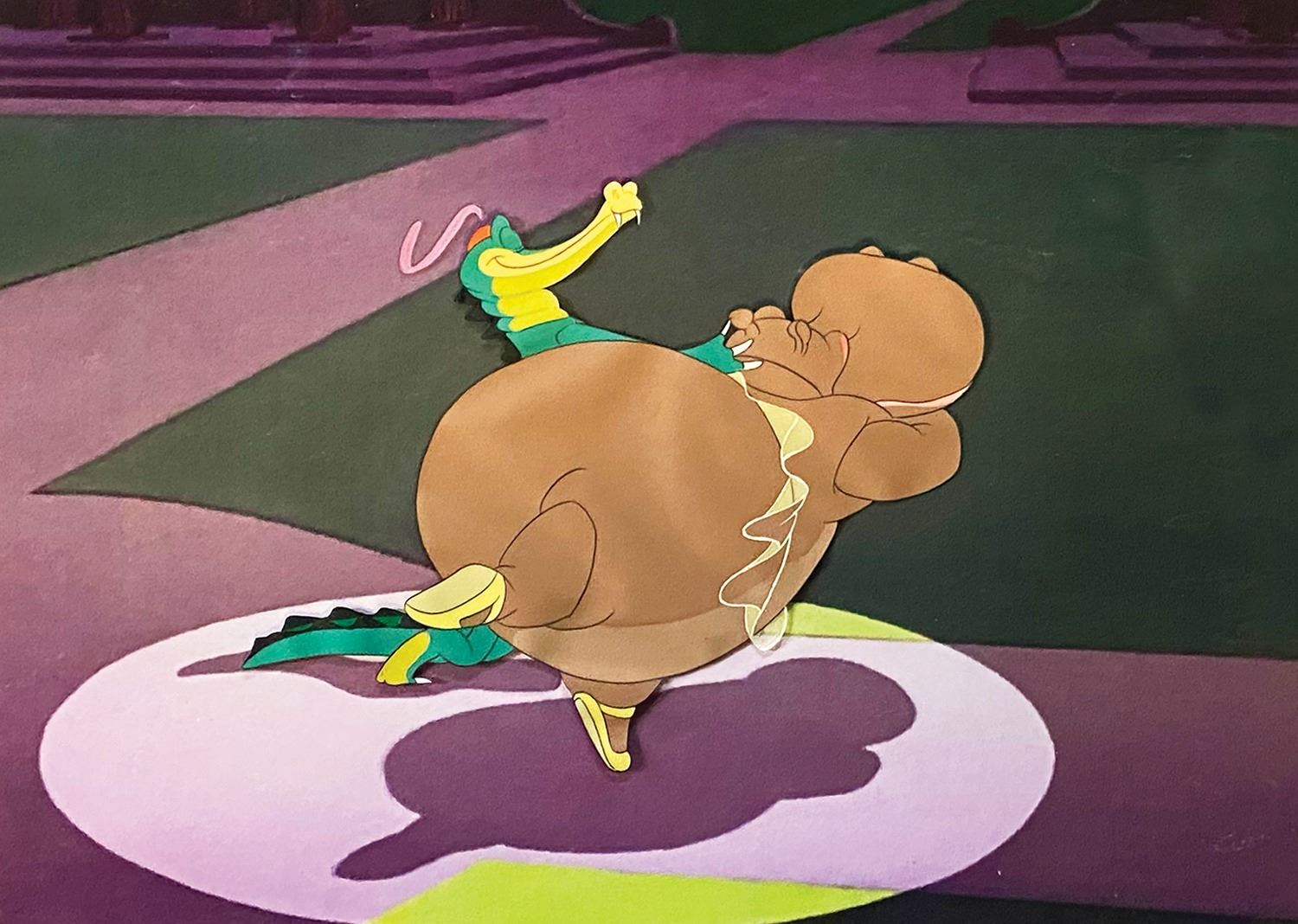 (Disney, 1940) An original production cel featuring Ben Ali-Gator and Hyacinth Hippo from the "Dance of the Hours" sequence of Fantasia. The image size of the two characters is 6.5"x8" and the untrimmed 12"x15.5" cel has been placed on a matching printed background. The cel is in very fine condition with only light wrinkling around the edges.