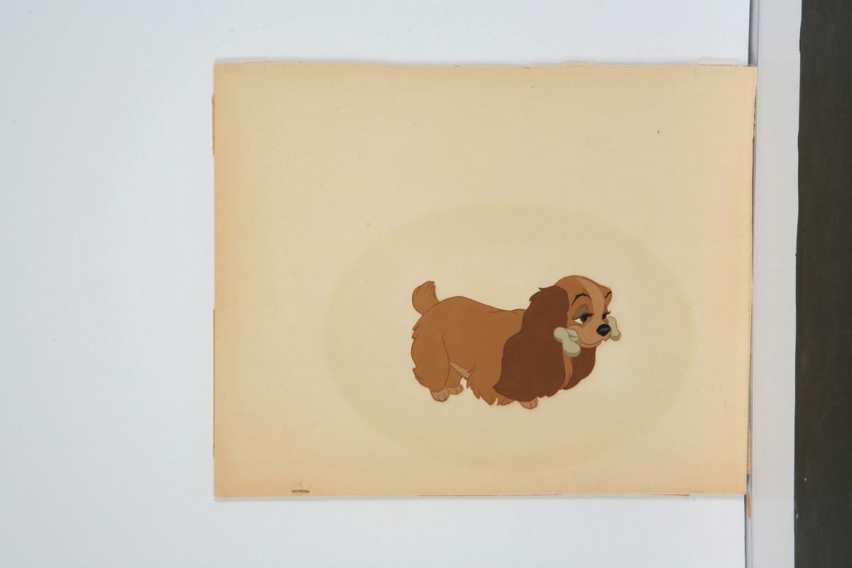 (Walt Disney Studios, 1955) An original hand-painted production cel of Lady from "Lady and the Tramp". This cel was sold at the Disneyland Art Corner, and still retains its original Walt Disney Productions gold label on the reverse of its board backing. The cel is lightly taped along the edges to its original backing and measures 8"x10". In very fine condition.