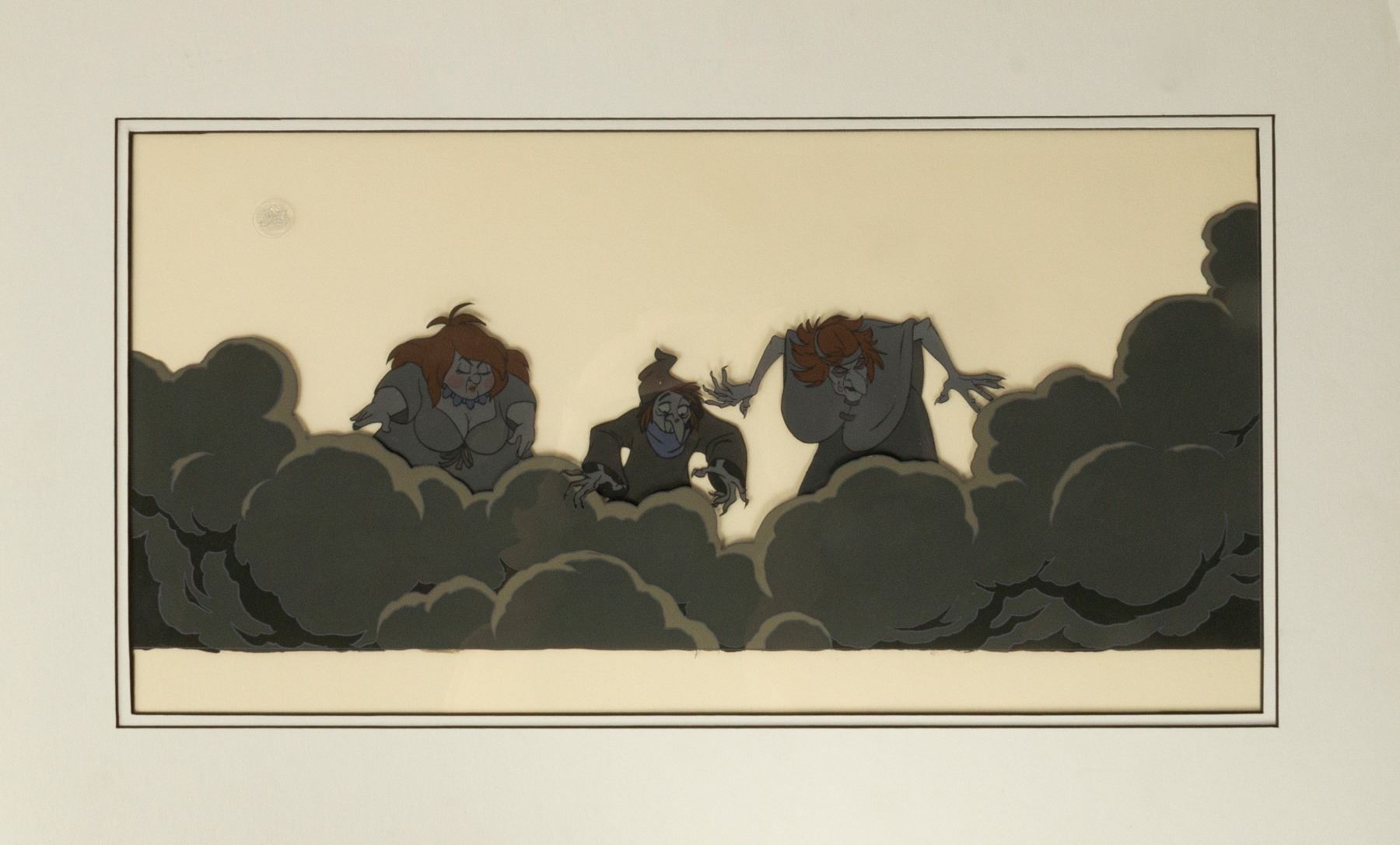 (Walt Disney Studios, 1985) An original production cel from Walt Disney's The Black Cauldron. This cel features the three witches Orddu, Orwen, and Orgoch peering over a large cloud of hand-painted smoke. This cel displays nicely, as the cel set-up appears to be composed of three separate layers. The cel has an image size of 10.25"x19" within its 15"x24" mat and is stamped with The Walt Disney Company seal in the top-left corner. The condition is very good with minor wear.