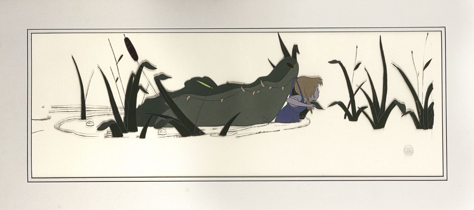 (Walt Disney Studios, 1977) An original panoramic production cel from Walt Disney's The Rescuers. This hand-painted cel features Brutus the crocodile pulling Penny through the swamp water and reeds. With an impressive image size of 10"x29" within its 15"x34" mat, the cel is in very fine condition with some edge-wear to the mat. The Walt Disney Company seal is in the bottom-right corner of the cel sheet.