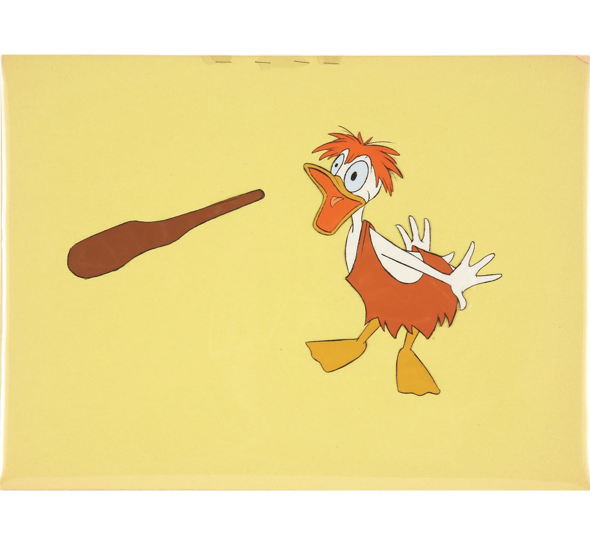 (Disney Studio, 1960s) Original production cel of Donald Duck from a 1960s production. The cel has been trimmed to 8" x 10" as prepared for sale at the Art Corner in Disneyland. The Disneyland gold label is on the reverse. The total image size is 5.5" x 9" in very good condition.