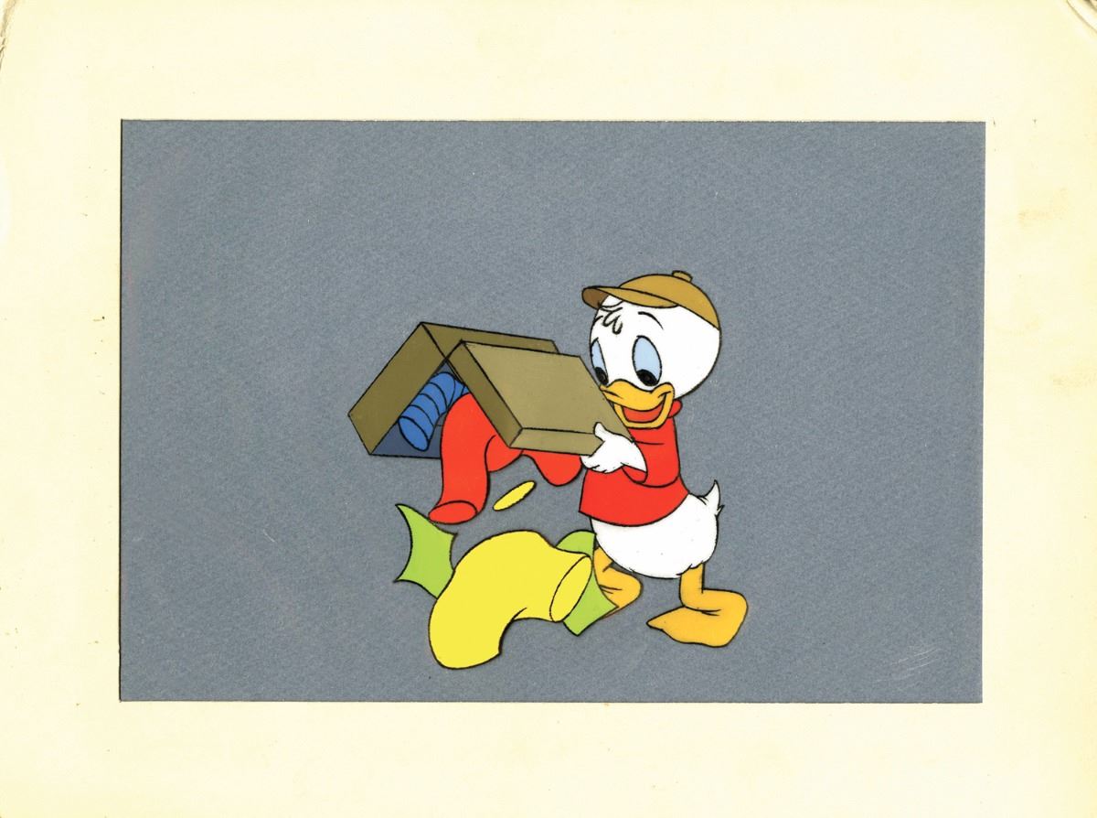(Walt Disney Studios, 1958) An original hand-painted production cel of Donald Duck's nephew Huey. This cel was sold at the Disneyland Art Corner, and still retains its original gold label on the reverse of its board backing. The cel is lightly taped to its original backing and measures 9"x12". In good condition with minimal wear to the cel paint and mat.