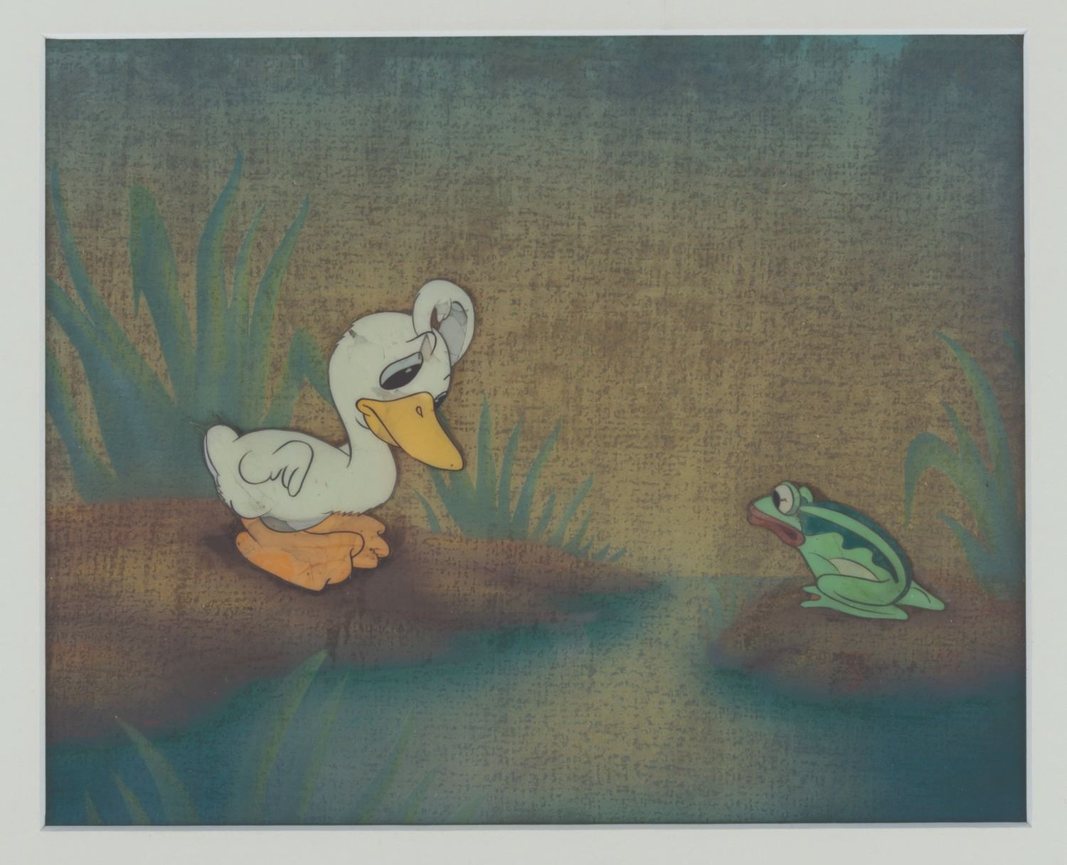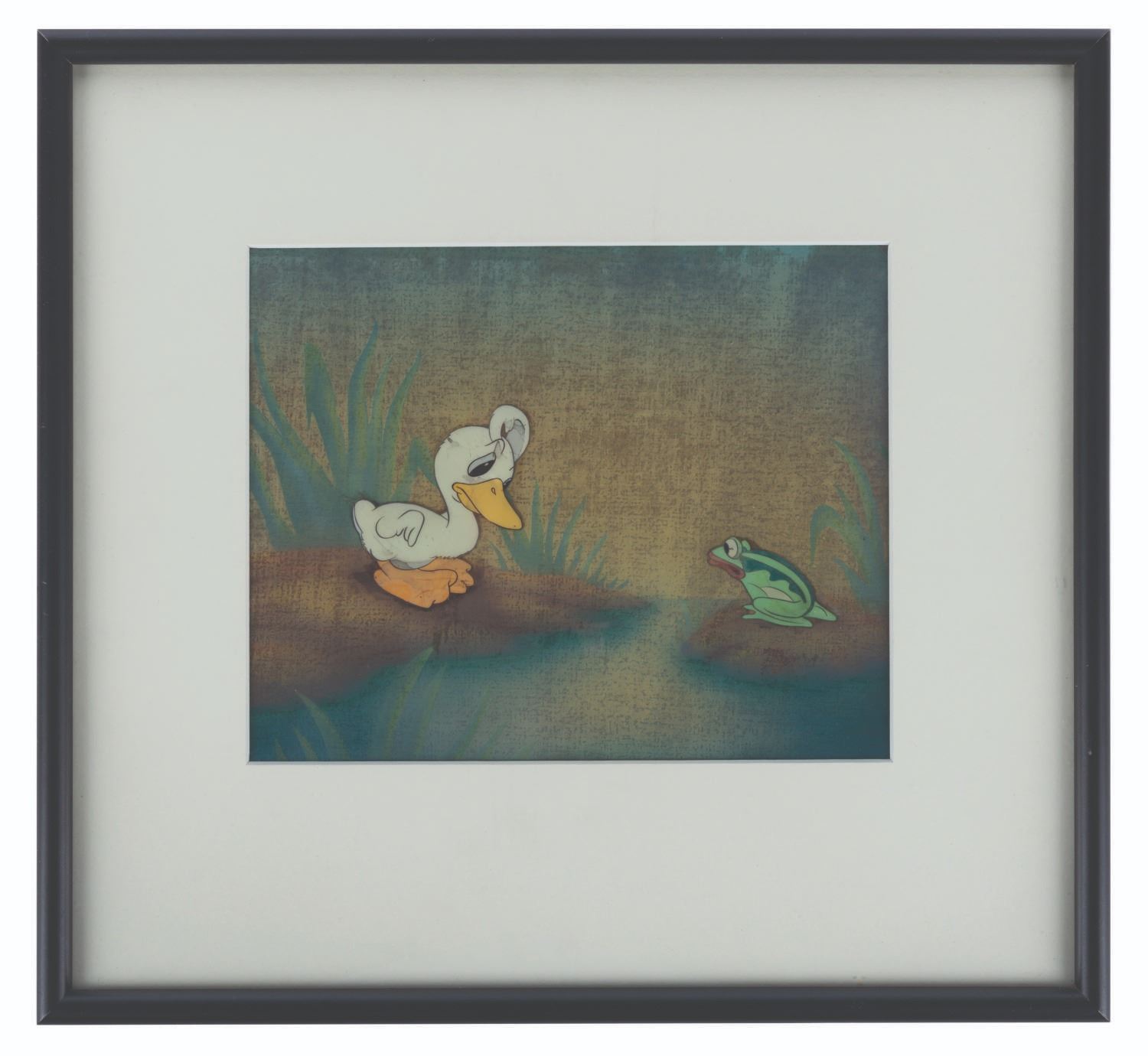 (Disney, 1939) A darling pair of original production cels from Walt Disney's Academy Award-winning short, "The Ugly Duckling." The cels have been trimmed to image and applied to a custom airbrushed background as prepared by Courvoisier Galleries for sale. The entire piece measures 8"x6.5". There is lifting and cracking throughout the duckling cel, but the image still presents nicely. The background has heavy glue staining throughout, as is common with these types of pieces.