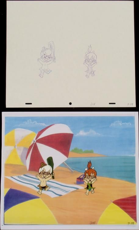 Here, Bam Bam and Pebbles are running on the beach. The cel comes with a matching drawing overlay. * * Original Production Art Cel, Drawing, and Reproduction Background Original "rough" animation drawing, with notations in black. Bam Bam and Pebbles have been outlined in purple Overall Size of the Cel: 10 1/2" x 12 1/2" Overall Size of Reproduction Background: 11" x 13 1/4" * Excellent condition This is an original hand-painted cel set-up used in the production of an episode of "The Flintstones." Each one-of-a-kind set-up represents a slight change in position of the characters. When individually photographed and projected in rapid succession, the images appear to move. * To create production cels, the original animator's drawing is transferred onto an acetate cel (by hand-inking and/or photo copying). The cel is then hand-painted on the reverse side. The background accompanying this set-up is a reproduction background. * * The cel, drawing, and background are ready to be matted and framed. The animator's notations are shown at the bottom of the cel and drawing. *