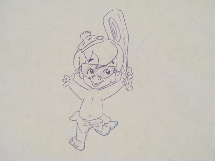 Here, Bam Bam and Pebbles are running on the beach. The cel comes with a matching drawing overlay. * * Original Production Art Cel, Drawing, and Reproduction Background Original "rough" animation drawing, with notations in black. Bam Bam and Pebbles have been outlined in purple Overall Size of the Cel: 10 1/2" x 12 1/2" Overall Size of Reproduction Background: 11" x 13 1/4" * Excellent condition This is an original hand-painted cel set-up used in the production of an episode of "The Flintstones." Each one-of-a-kind set-up represents a slight change in position of the characters. When individually photographed and projected in rapid succession, the images appear to move. * To create production cels, the original animator's drawing is transferred onto an acetate cel (by hand-inking and/or photo copying). The cel is then hand-painted on the reverse side. The background accompanying this set-up is a reproduction background. * * The cel, drawing, and background are ready to be matted and framed. The animator's notations are shown at the bottom of the cel and drawing. *