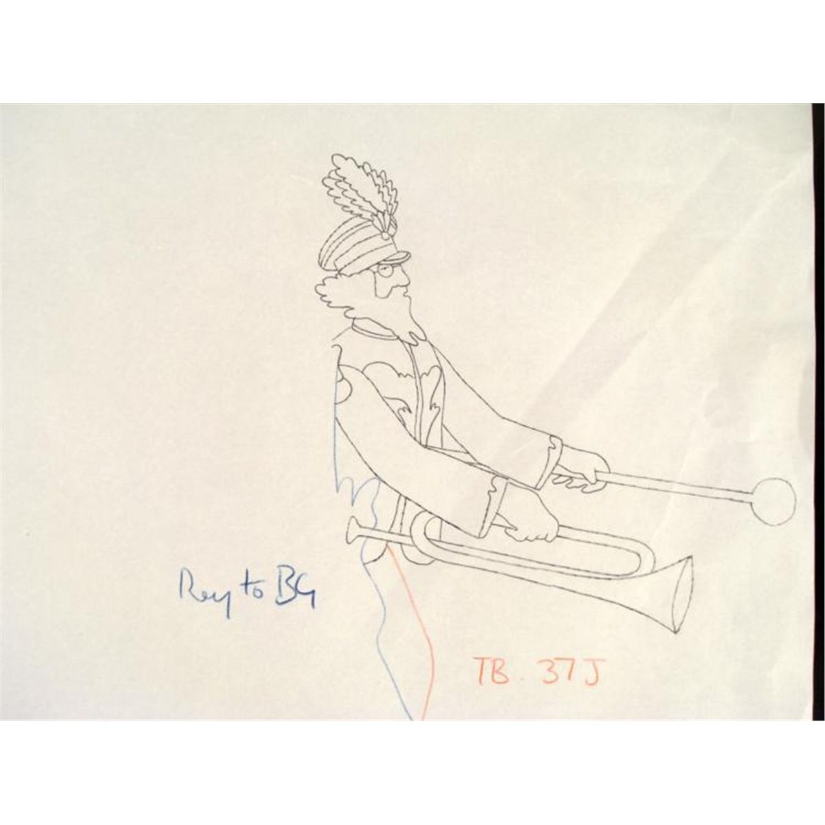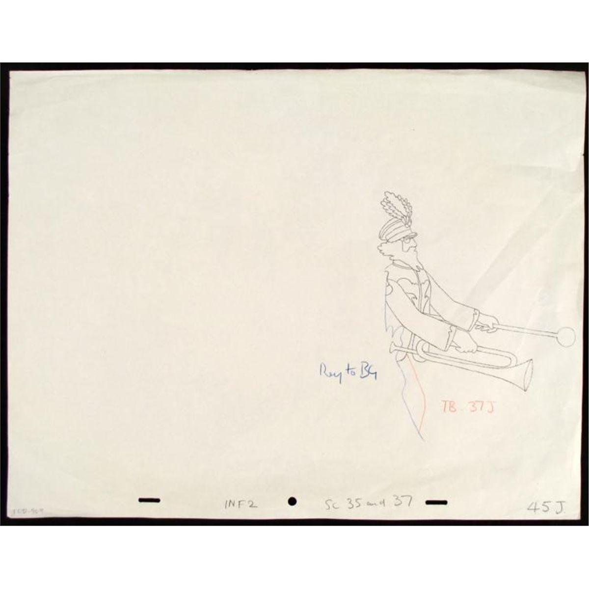 Here, it looks like this instrument player is a one man band. * Original "rough" animation drawing, in blue, black, and red with the notations in blue, black, and red. * Overall size is a 12-field drawing that is 12 1/2" x 16" Very Good condition; has been stored * Traditional animation is a multi-step process which includes various types of art techniques. Drawings are a key part of the process, in which the animator creates the design and movement of the characters. Drawings are then transferred onto acetate cels (by hand-inking and/or photo copying) to create a production cel, which is then hand painted on the back side, using paint colors chosen and approved by the creator of the series. * * The drawing is ready to be matted and framed. The animators notations are located at the top and bottom of the drawing. *