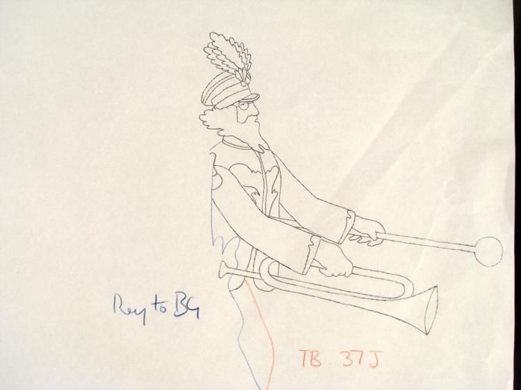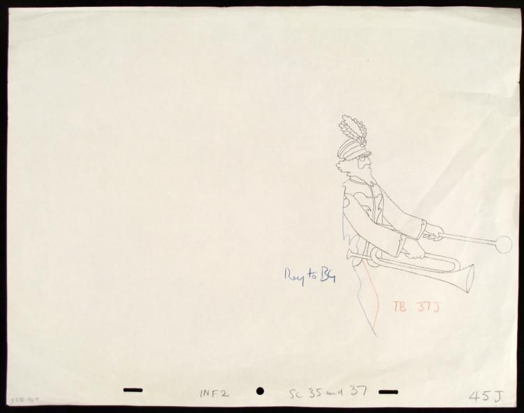 Here, it looks like this instrument player is a one man band. * Original "rough" animation drawing, in blue, black, and red with the notations in blue, black, and red. * Overall size is a 12-field drawing that is 12 1/2" x 16" Very Good condition; has been stored * Traditional animation is a multi-step process which includes various types of art techniques. Drawings are a key part of the process, in which the animator creates the design and movement of the characters. Drawings are then transferred onto acetate cels (by hand-inking and/or photo copying) to create a production cel, which is then hand painted on the back side, using paint colors chosen and approved by the creator of the series. * * The drawing is ready to be matted and framed. The animators notations are located at the top and bottom of the drawing. *