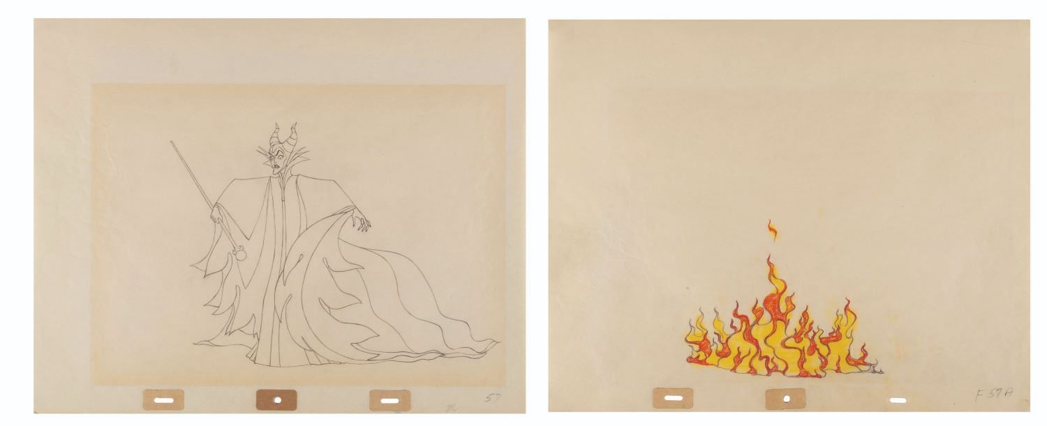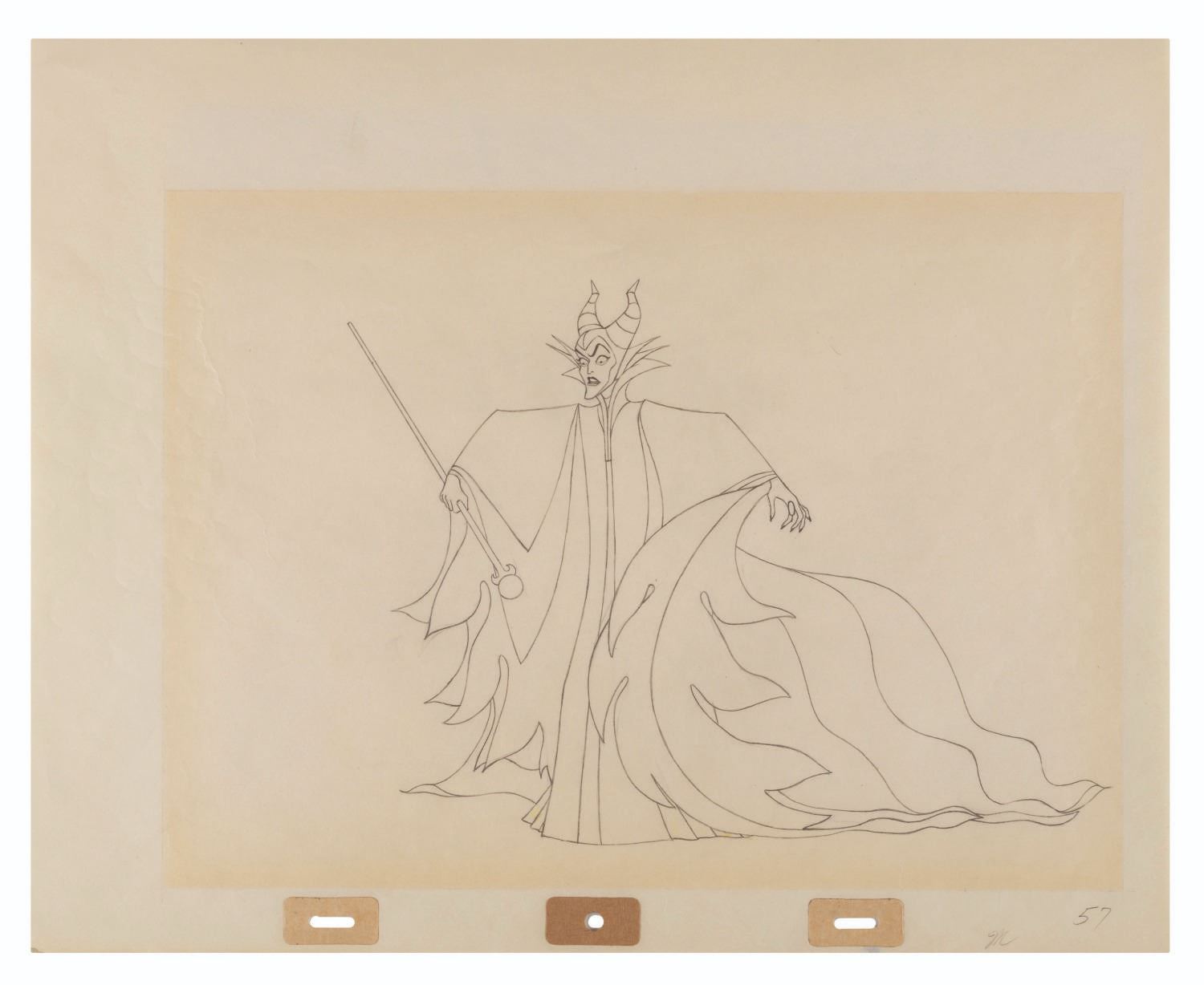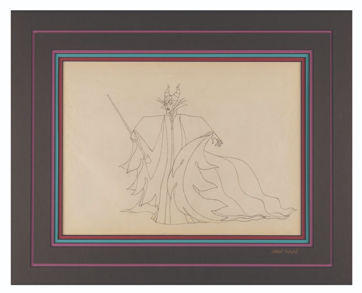 (Disney, 1959) A pair of original production drawings featuring Maleficent and flame effects from Disney's 1959 feature film, "Sleeping Beauty." The image of Maleficent measures 9.5"x7.5" and the flames measure 6"x4". Both are on untrimmed 15.5"x12.5" animation paper. The drawings come with a custom mat hand signed by Disney Legend Marc Davis. Both drawings are in good condition with expected wear. The Maleficent drawing has yellowed in the area exposed in the mat.
