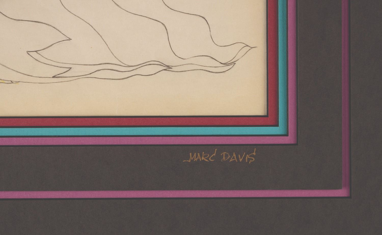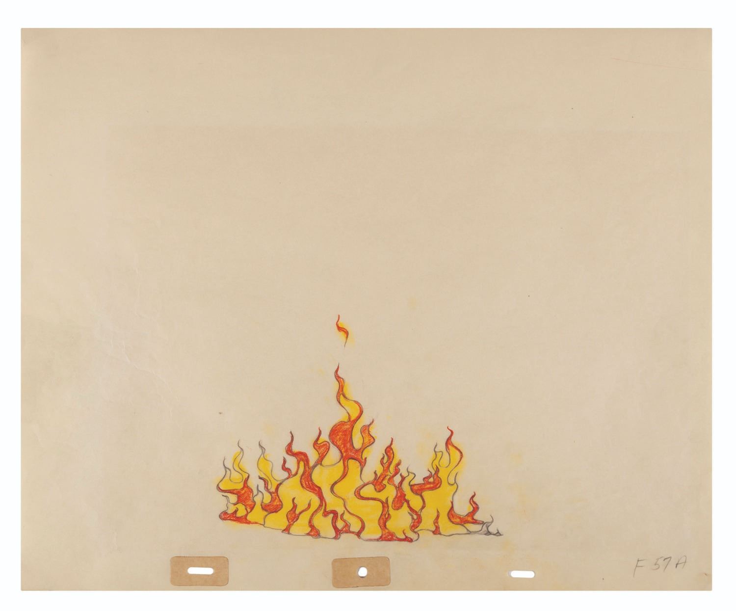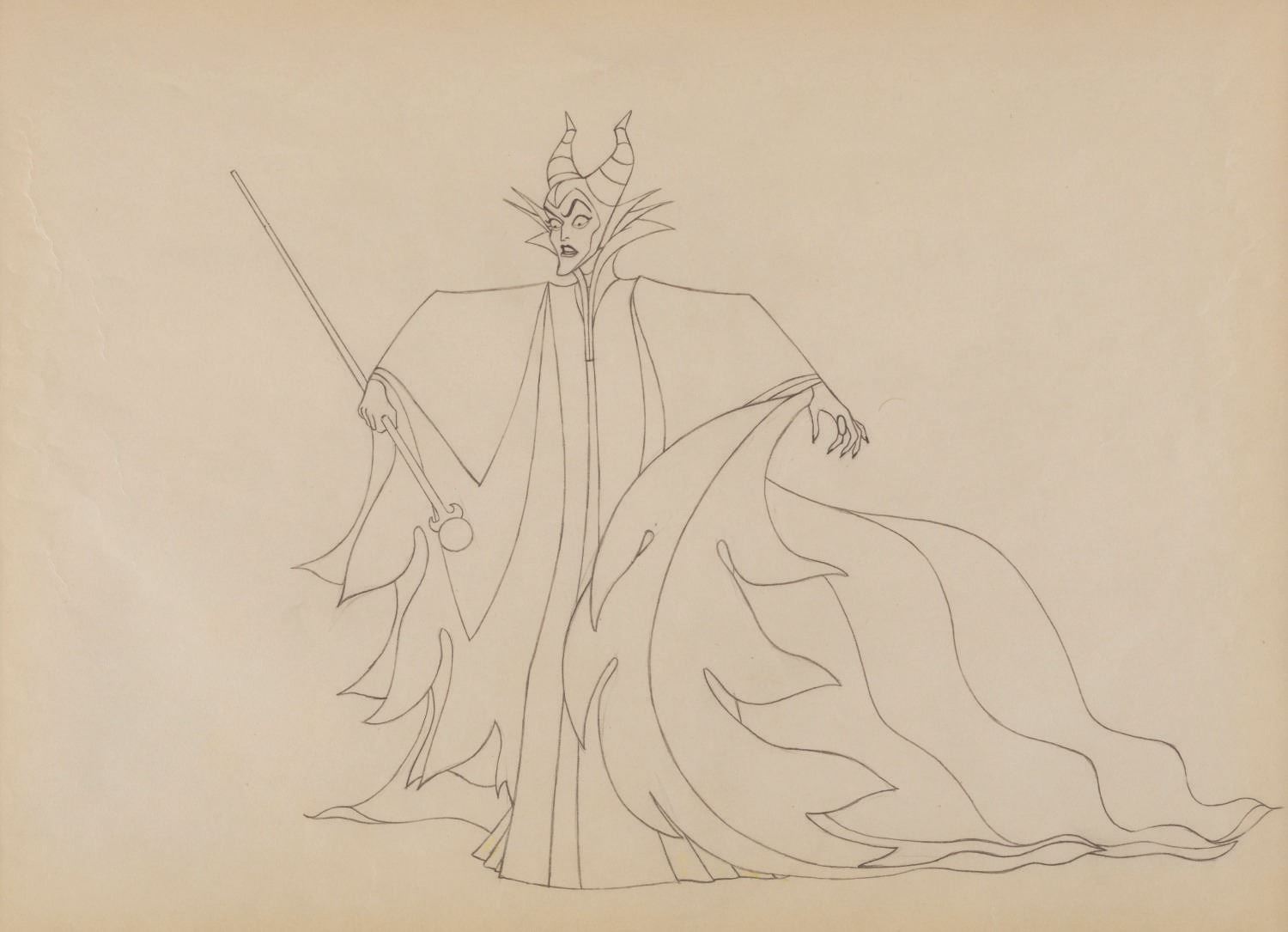 (Disney, 1959) A pair of original production drawings featuring Maleficent and flame effects from Disney's 1959 feature film, "Sleeping Beauty." The image of Maleficent measures 9.5"x7.5" and the flames measure 6"x4". Both are on untrimmed 15.5"x12.5" animation paper. The drawings come with a custom mat hand signed by Disney Legend Marc Davis. Both drawings are in good condition with expected wear. The Maleficent drawing has yellowed in the area exposed in the mat.