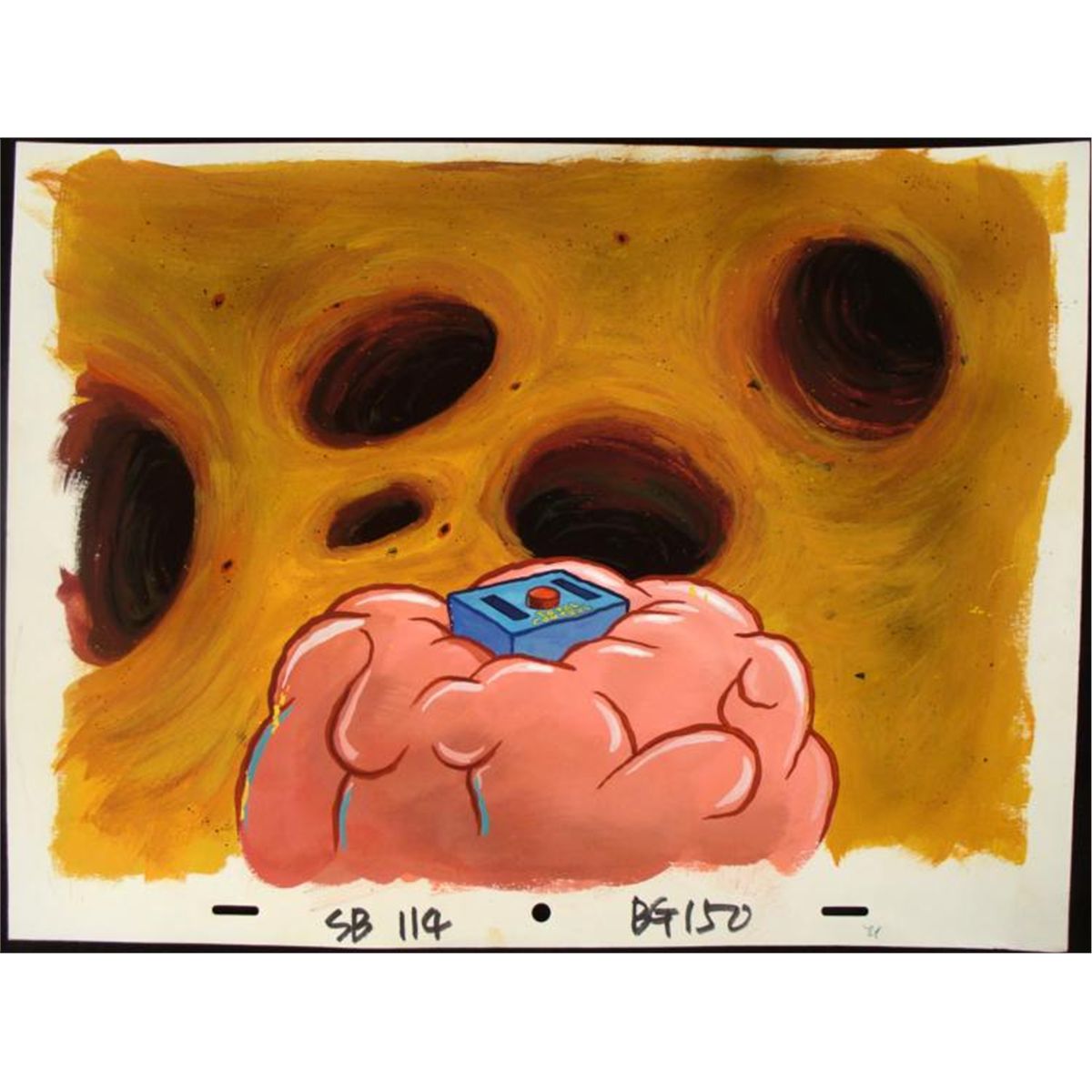 Normal 0 false false false MicrosoftInternetExplorer4 /* Style Definitions */ table.MsoNormalTable{mso-style-name:"Table Normal";mso-tstyle-rowband-size:0;mso-tstyle-colband-size:0;mso-style-noshow:yes;mso-style-parent:"";mso-padding-alt:0in 5.4pt 0in 5.4pt;mso-para-margin:0in;mso-para-margin-bottom:.0001pt;mso-pagination:widow-orphan;font-size:10.0pt;font-family:"Times New Roman";mso-ansi-language:#0400;mso-fareast-language:#0400;mso-bidi-language:#0400;}This original hand-painted background is from the Nickelodeon TVs how SpongeBob Squarepants. The story takes place under the deep blue sea in Bikini Bottom, where SpongeBob resides. SpongeBob, who is a yellow, porous sponge, is your typical happy-go-lucky character, as he is always cheerful and enjoys making people laugh. Patrick Star, SpongeBob's neighbor who is a starfish, is your average children's show idiot, as he boasts knowing nothing and is often getting himself into ridiculous situations. Between the homes of these two lies the home of the miserable Squidward, a squid, who is known for being grouchy and playing tricks on SpongeBob and Patrick. BothSpongeBob and Squidward work at the Krusty Krab, a fast food business run by the greedy money-loving Mr. Krabs, a crab, the arch rival of the evil, possibly misunderstood, Plankton. Another neighbor, Sandy Cheeks, an athletic squirrel who normally wears an astronaut's space suit, was introduced in "Tea at the Treedome." She spends most of her time inventing and experimenting. * Total mind control, what else more could you ask for?? * * Original Production Background Overall Size of Background: 10 1/4" x 14" Very good condition; it has been stored Original Production Backgrounds are used in the making of the final version of animated productions. The background establishes the location and the overall good mood of the scene. Typically, a background layout artist creates a drawing to establish the content of the scene, placement of characters, perspective and camera angle. Based on this drawing, the background artist creates a preliminary painting to confirm all of the scenes details, then the final production background which is used in the filming of the scene. When these backgrounds are individually photographed behind the progression of production cels, and projected at a rapid succession, the images in the foreground appear to move, creating an animated scene. * The background is ready to be matted and framed. It is a colored background with the animator's notations at the bottom. *