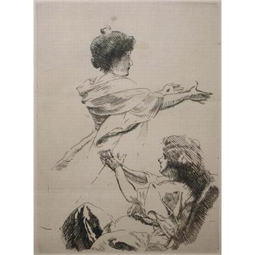 Eau-Forte d'Albert Besnard, Etude pour "L'Ile Heureuse" (panneau du musee des Arts Decoratifs). Written in pencil: "Epreuve originale." Raised seal on lower left reads: "Societe des amis du Louvre." Albert Besnard (1849-1934)was a French painter and printer known for his studies of women. He was an admirer of the simplicity of Japanese printmaking which influenced his work. He received importan commissions including a panneau for the Musee des Arts Decoratifs for which this study was made. Overall toning, four horizontal fold marks. Additional photos available upon request. Please send us an email with your state, country and zip code so we can estimate shipping charges to your location.