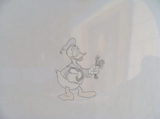 Walt Disney's DuckTales was the first daily animated cartoon show to air weekdays on the Disney Afternoon. DuckTales debuted in 1988. The 1988 - 1989 season consisted of 65 episodes. The next season (1989 - 1990) included an additional 35 episodes, totaling 100. DuckTales is an extremely unique and original cartoon. Episodes such as "Sweet Duck of Youth," "Dr Jekyll and Mr. McDuck," "The Golden Fleecing" and many more play off of legends, literature, and actual historic events. Disney's DuckTales also uses clever "duck" names for characters, as well as creatively used puns to add life to this excellent show. At the beginning of the series, Donald leaves Huey, Dewey and Louie in his Uncle Scrooge's care while he serves with the Navy. Donald is sometimes mentioned when the main characters receive mail and pictures from him, and is very occasionally a guest star for an episode. There is a matching original drawing overlay that is on top of the cel. It appears that Donald is setting himself up for a disappointment in this cel. Production cel: A hand-painted animation cel that was actually used to create one frame of an animated scene that appeared in a cartoon. Original Production Cel Art with Background Copy Original "rough" animation drawing, with the notations in black. Donald has been penciled in with black Overall Size of the Cel: 10 1/2" × 12 1/2" Overall Size of Background Copy: 10 1/2" x 12 1/2" Overall Size of Drawing: 10 1/2" x 12 3/8" © Disney Excellent Condition Traditional animation is a multi-step process which includes various types of art techniques. Drawings are a key part of the process, in which the animator creates the design and movement of the characters. Drawings are then transferred onto acetate cels (by hand-inking and/or photo copying) to create a production cel, which is then hand-painted on the back side, using paint colors chosen and approved by the creators of the series.The background and cel are ready to trimmed, matted, and framed. The animator's notations are shown at the bottom of the cel, drawing, and background. There is the Disney stamp shown at the bottom of the background.