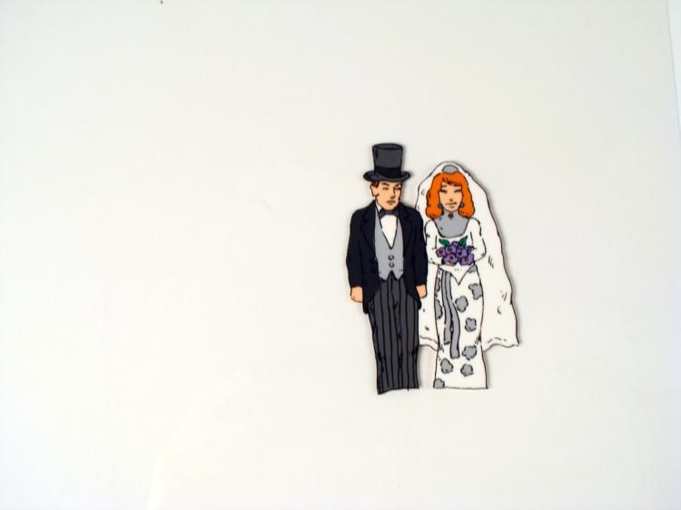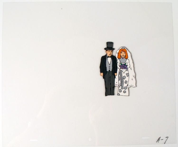 This is an original animation cel of a bride and groom. * * * * Bride: This is happiest moment in my life!! Groom: I told her not to buy that dress... How can this day get any worse?? * * * Medium: Hand painted acetate cel * * Cel size: 10 1/2" x 12 1/2" * * Notations: Bottom of cel * * Condition: Excellent