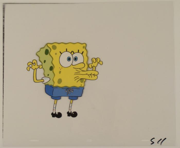 This original animation cel is from the Nickelodeon TV show SpongeBob Squarepants. The story takes place under the deep blue sea in Bikini Bottom, where SpongeBob resides. SpongeBob, who is a yellow, porous sponge, is your typical happy-go-lucky character, as he is always cheerful and enjoys making people laugh. Patrick Star, SpongeBob's neighbor who is a starfish, is your average children's show idiot, as he boasts knowing nothing and is often getting himself into ridiculous situations. Between the homes of these two lies the home of the miserable Squidward, a squid, who is known for being grouchy and playing tricks on SpongeBob and Patrick. Both SpongeBob and Squidward work at the Krusty Krab, a fast food business run by the greedy money-loving Mr. Krabs, a crab, the arch rival of the evil, possibly misunderstood, Plankton. Another neighbor, Sandy Cheeks, an athletic squirrel who normally wears an astronaut's space suit, was introduced in "Tea at the Treedome." She spends most of her time inventing and experimenting. Pucker up Spongebob...Original Production Animated Cel Overall Size of Cel: 10 1/2" x 12 1/2" Excellent ConditionThis is an original hand-painted cel set-up used in the production of an episode of "SpongeBob SquarePants." Each one-of-a-kind set-up represents a slight change in position of the characters. When individually photographed and projected in rapid succession, the images appear to move.