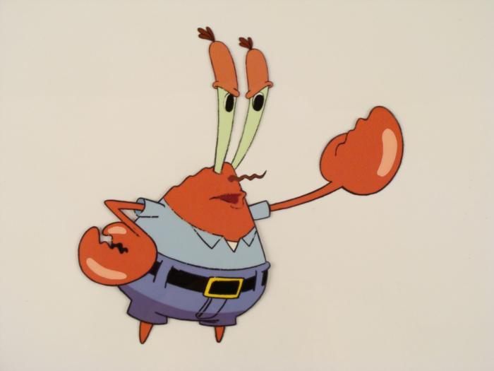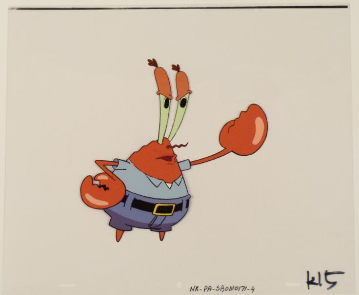 This original animation cel is from the Nickelodeon TV show SpongeBob Squarepants. The story takes place under the deep blue sea in Bikini Bottom, where SpongeBob resides. SpongeBob, who is a yellow, porous sponge, is your typical happy-go-lucky character, as he is always cheerful and enjoys making people laugh. Patrick Star, SpongeBob's neighbor who is a starfish, is your average children's show idiot, as he boasts knowing nothing and is often getting himself into ridiculous situations. Between the homes of these two lies the home of the miserable Squidward, a squid, who is known for being grouchy and playing tricks on SpongeBob and Patrick. Both SpongeBob and Squidward work at the Krusty Krab, a fast food business run by the greedy money-loving Mr. Krabs, a crab, the arch rival of the evil, possibly misunderstood, Plankton. Another neighbor, Sandy Cheeks, an athletic squirrel who normally wears an astronaut's space suit, was introduced in "Tea at the Treedome." She spends most of her time inventing and experimenting. Why is Mr. Krabs putting his hand up?Original Production Animated Cel Overall Size of Cel: 10 1/2" x 12 1/2" Very Good ConditionThis is an original hand-painted cel set-up used in the production of an episode of "SpongeBob SquarePants." Each one-of-a-kind set-up represents a slight change in position of the characters. When individually photographed and projected in rapid succession, the images appear to move.