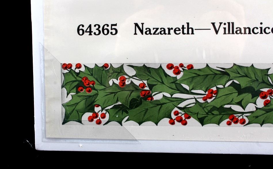 This is an original RCA Victor Christmas records poster from 1916. The poster showcases numerous international records from RCA Victor. The piece shows a wonderfully decorated mistletoe border with the Victor logo in the center of the bottom. The bottom right corner is marked "3352-EOQ-9-29-16". The Victor poster is in good overall condition with minor water staining on the top corner as shown. The poster measures 21" x 43.5".