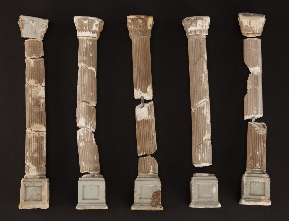 (Columbia, 1956) Five puppetted columns used in the dramatic sequence when the military fires its electromagnetic/ultrasonic weapon causing the flying saucer to crash into the U.S. House of Representatives in Washington, D.C. These support columns are constructed of plaster with internal rods for puppeteering to simulate crumbling under impact from the saucer. They measures approx. 7 ½ in. long. A wonderful collection of puppet elements from the visual effects genius of Ray Harryhausen. Formerly of the Forrest J Ackerman collection.