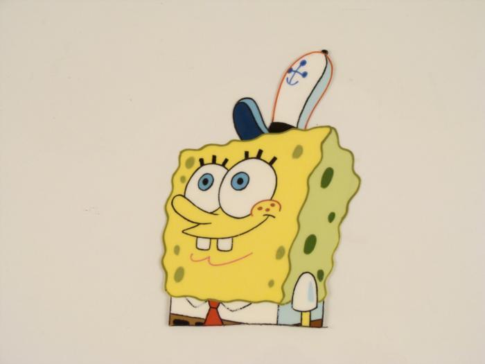 This original animation cel is from the Nickelodeon TV show SpongeBob Squarepants. The story takes place under the deep blue sea in Bikini Bottom, where SpongeBob resides. SpongeBob, who is a yellow, porous sponge, is your typical happy-go-lucky character, as he is always cheerful and enjoys making people laugh. Patrick Star, SpongeBob's neighbor who is a starfish, is your average children's show idiot, as he boasts knowing nothing and is often getting himself into ridiculous situations. Between the homes of these two lies the home of the miserable Squidward, a squid, who is known for being grouchy and playing tricks on SpongeBob and Patrick. Both SpongeBob and Squidward work at the Krusty Krab, a fast food business run by the greedy money-loving Mr. Krabs, a crab, the arch rival of the evil, possibly misunderstood, Plankton. Another neighbor, Sandy Cheeks, an athletic squirrel who normally wears an astronaut's space suit, was introduced in "Tea at the Treedome." She spends most of her time inventing and experimenting. SpongeBob is ready for work.Original Production Animated Cel Overall Size of Cel: 10 1/2" x 12 1/2" Very Good ConditionThis is an original hand-painted cel set-up used in the production of an episode of "SpongeBob SquarePants." Each one-of-a-kind set-up represents a slight change in position of the characters. When individually photographed and projected in rapid succession, the images appear to move.