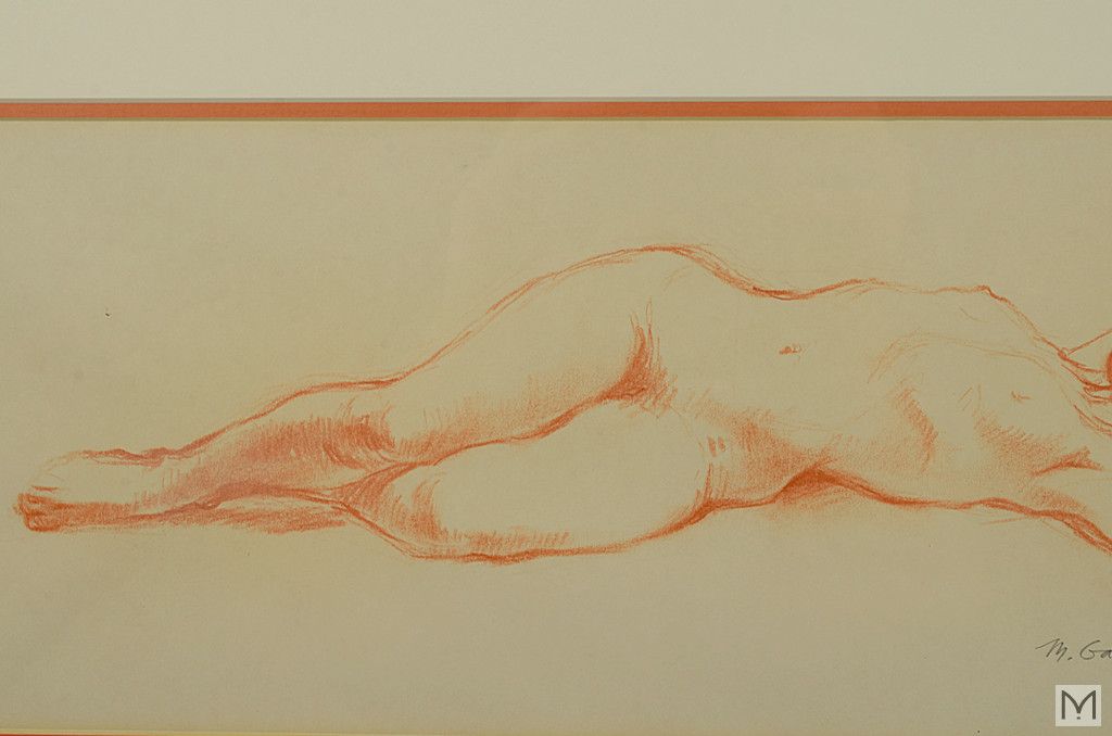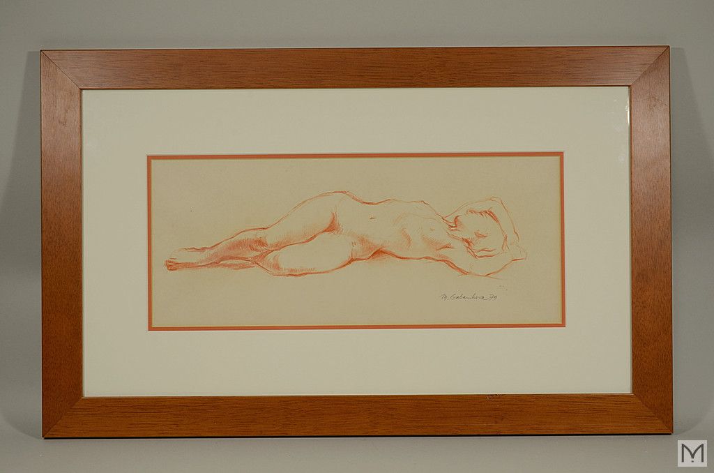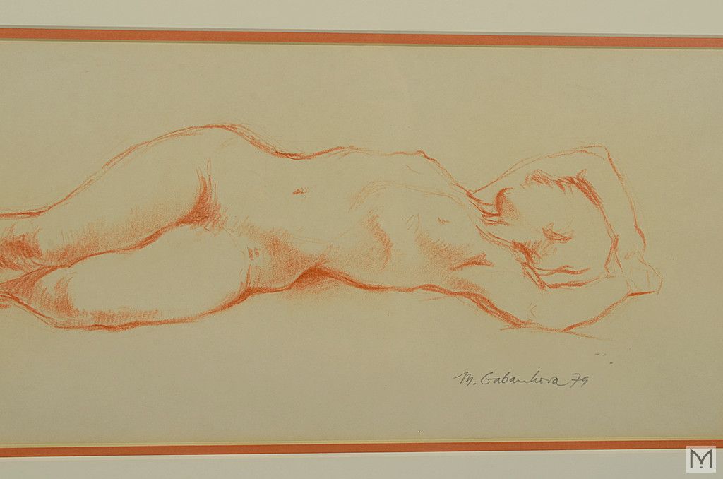 Original Red Chalk Drawing - Figure Study 'Reclining Nude' Signed Maria Gabankova (Czechoslovakian/Canadian) Framed under glass, wood frame. Signed, '79.