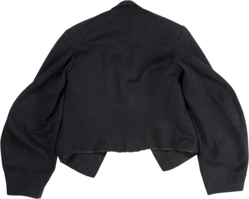Civil War Navy Officer's Jacket and Belt The 1864 U. S. Navy Regulations allowed officers to wear a short jacket such as this one as "service dress." The navy blue/black wool garment has a roll over collar and is lined with the appropriate, "black silk serge," nicely quilted. Two pockets are in the breast. The sleeves feature the typical Civil War era flared elbows and narrow cuffs and are lined in white cotton with thin red striping. The collar and front edges are edged in narrow black tape. There are two rows of nine Navy officers buttons on each side, backmarked "Scovill Mfg. Co." Condition is excellent with no mothing and inconsequential wear. The jacket is accompanied by a fine naval officers sword belt having a high-relief interlocking regulation belt plate depicting an eagle over an anchor surrounded by a circle of stars. The belt is complete, strong and supple and has both suspensory straps highlighted by large studs bearing an attractive "star" design. Altogether a scarce and wonderful set that would be hard to match for quality.