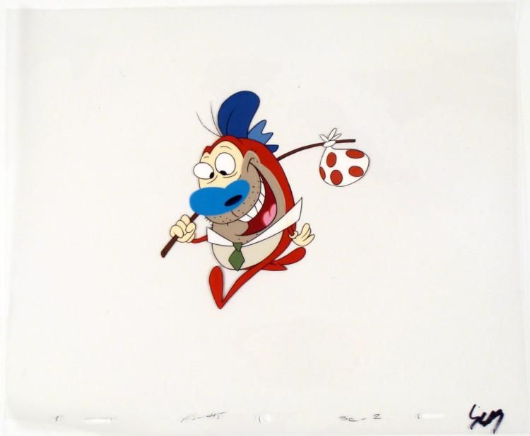 This is an original production animation cel from the Nickelodeon TV show Ren & Stimpy. The show follows two characters - Ren, a crazy Chihuahua - and - Stimpy, an incredibly stupid cat - as they think up to all kinds of hair brained schemes and get themselves into some sticky situations. The Ren and Stimpy Show debuted in August 1991 with a two-part episode, 'Stimpy's Big Day / The Big Shot' and became an instant hit. It was the third Nicktoon ever to be aired on the Network alongside Doug and Rugrats. Here, Stimpy has all of his belongings packed * * Original Production Art Cel Overall Size of the Cel: 10 1/2" x 1/2" Excellent condition This is an original hand-painted cel set-up used in the production of an episode of "The Ren & Stimpy Show." Each one-of-a-kind set-up represents a slight change in position of the characters. When individually photographed and projected in rapid succession, the images appear to move. * To create production cels, the original animator's drawing is transferred onto an acetate cel (by hand-inking and/or photo copying). The cel is then hand-painted on the reverse side. * The cel is ready to be matted and framed. The animator's notations are shown at the bottom of the cel. This cel desreves two thunbs up, buy it now! *