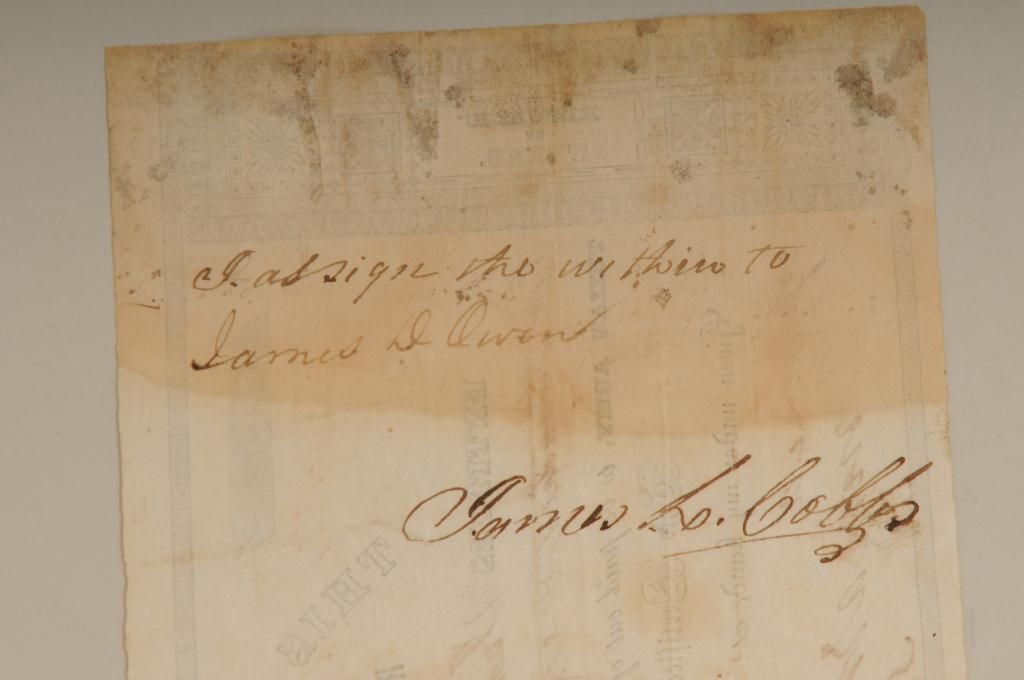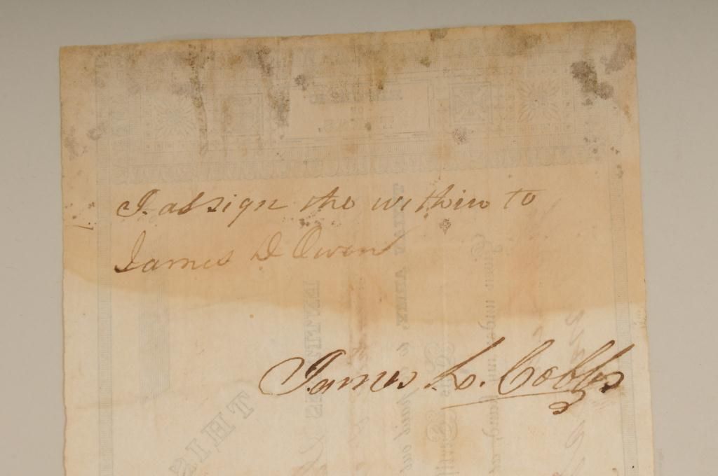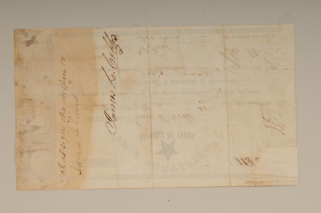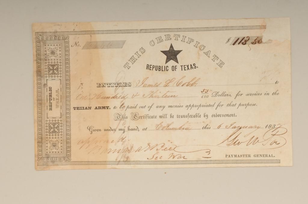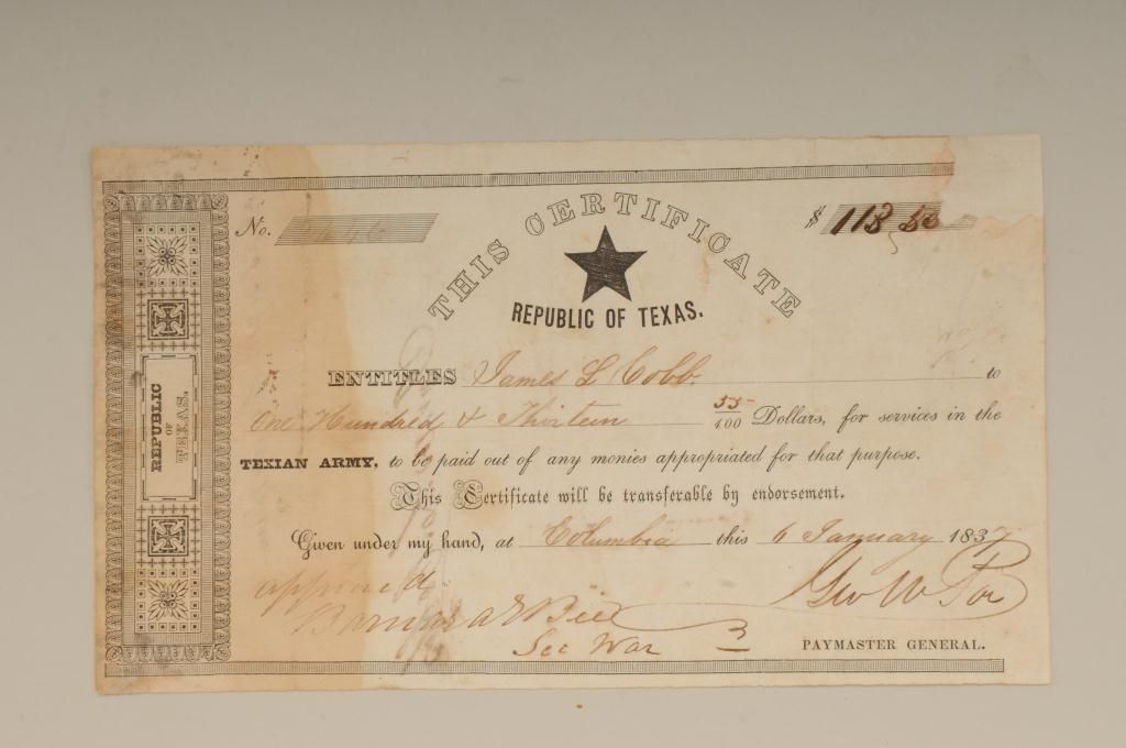 Original Republic of Texas Certificate for services in the "Texian Army", entitling one James L. Cobb a total of $113.50 for services in the army, dated January 6, 1837, approx. 4" x 7" in overall good condition with somediscoloration on the left side of the document but all readable; slight loss of top layer of paper of small section of upper right corner; endorsed by Cobb on the reverse: "I assign the within to James D.Owen". A rare piece of early Texas history, particularly considering this document was issued less than a year after the 13-day battle of the Alamo! Est.: $400-$800.